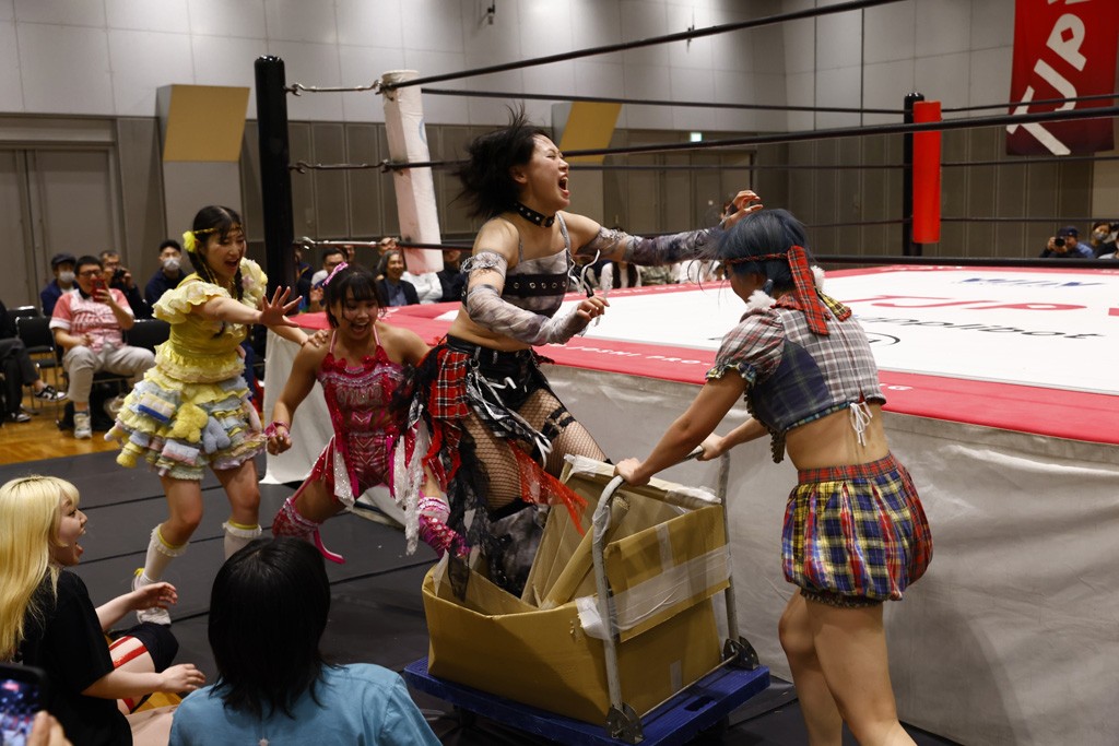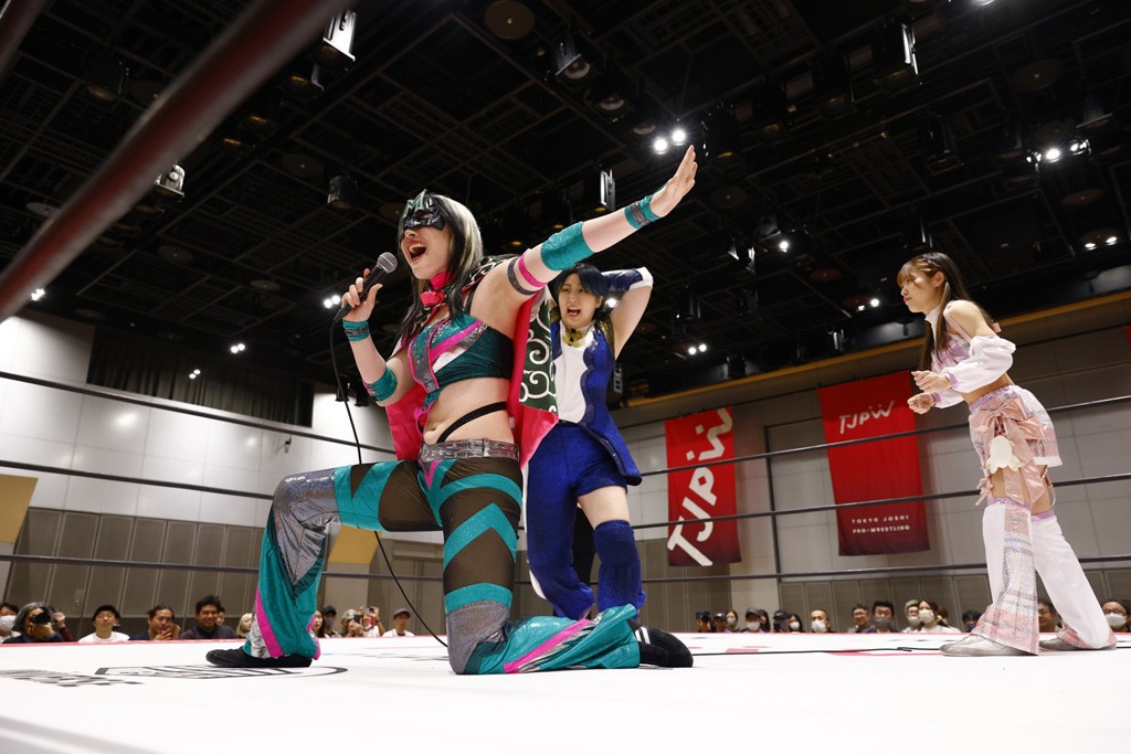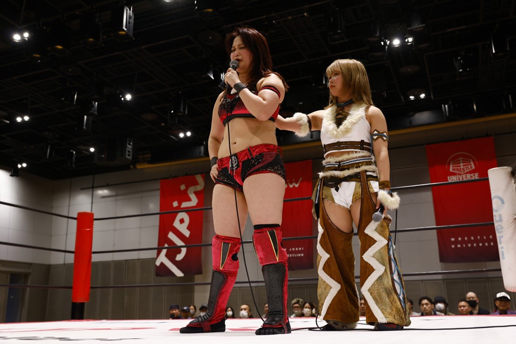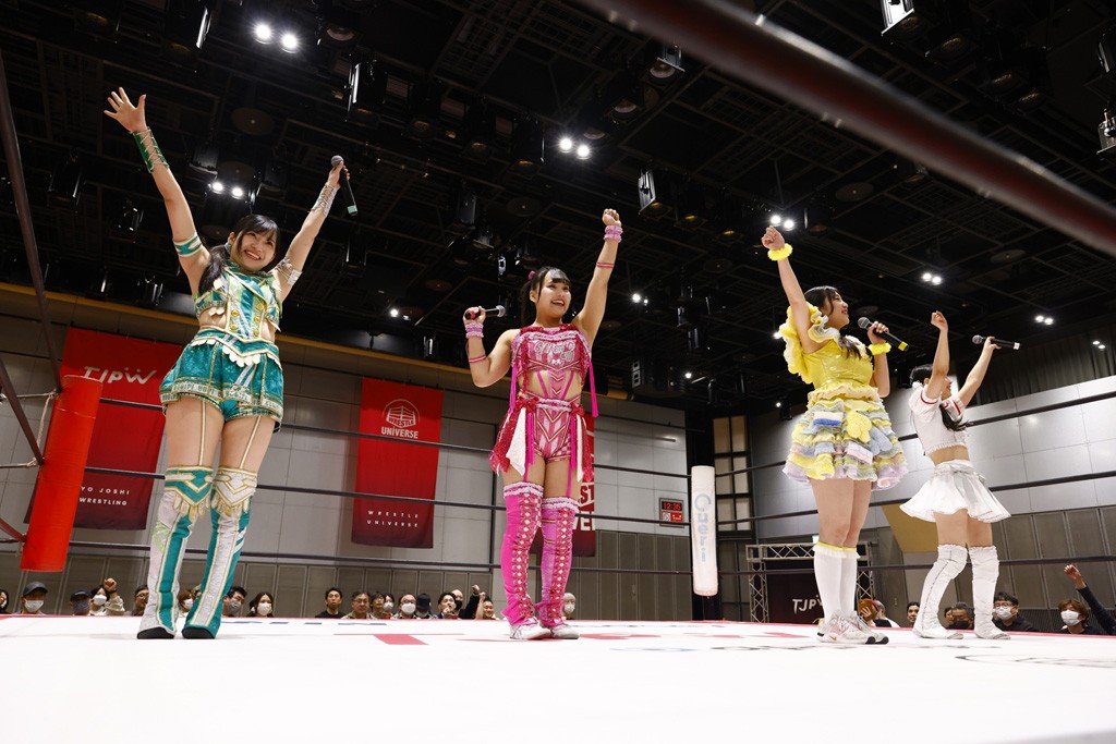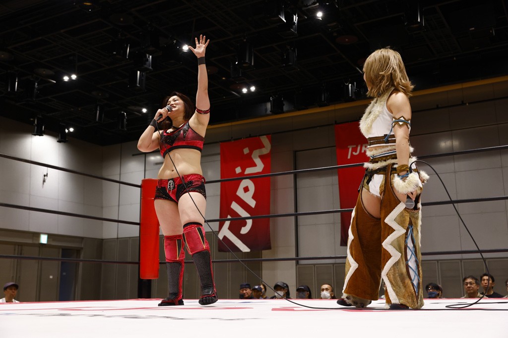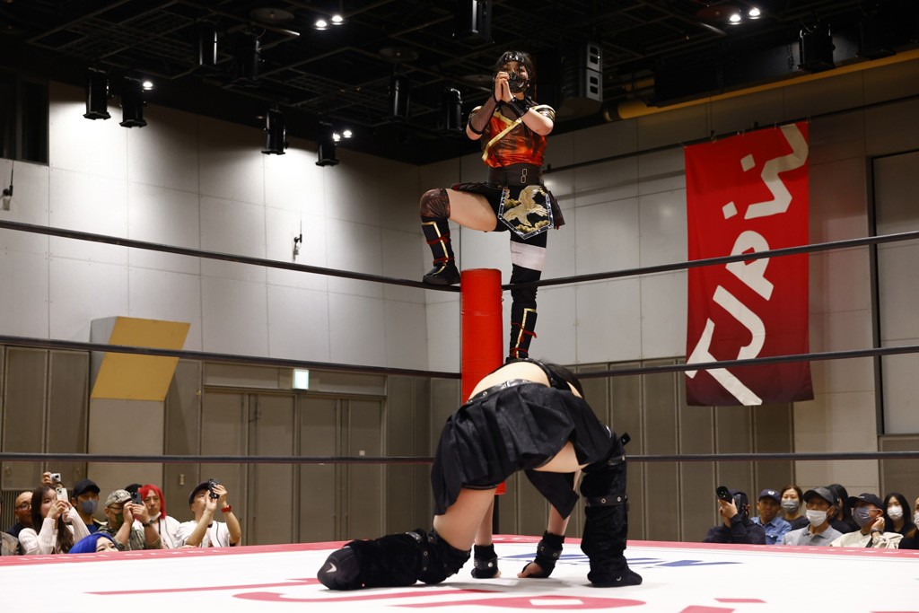 芦田 福岡ありがとうございました。無事私たち人が勝てていい連戦の締めになりましたね。そしてこれが挑戦権を懸けた5WAYにつながるわけですが、私の意気込み言ってもいいですか? 私はもともと東女に入ってから、このIPのベルトを一番最初に挑戦するベルトにしたかったし、一番最初に腰に巻くベルトにしたかったんです。それでこの前アメリカ遠征も経験させてもらって、やっぱり私はあのIPのベルトを巻いて、海外で試合をしまくってしまくってしまくって、東京女子をもっと世界的に有名にしたいという気持ちが強くなったので、今回、IPのベルトに挑戦するのは私です。