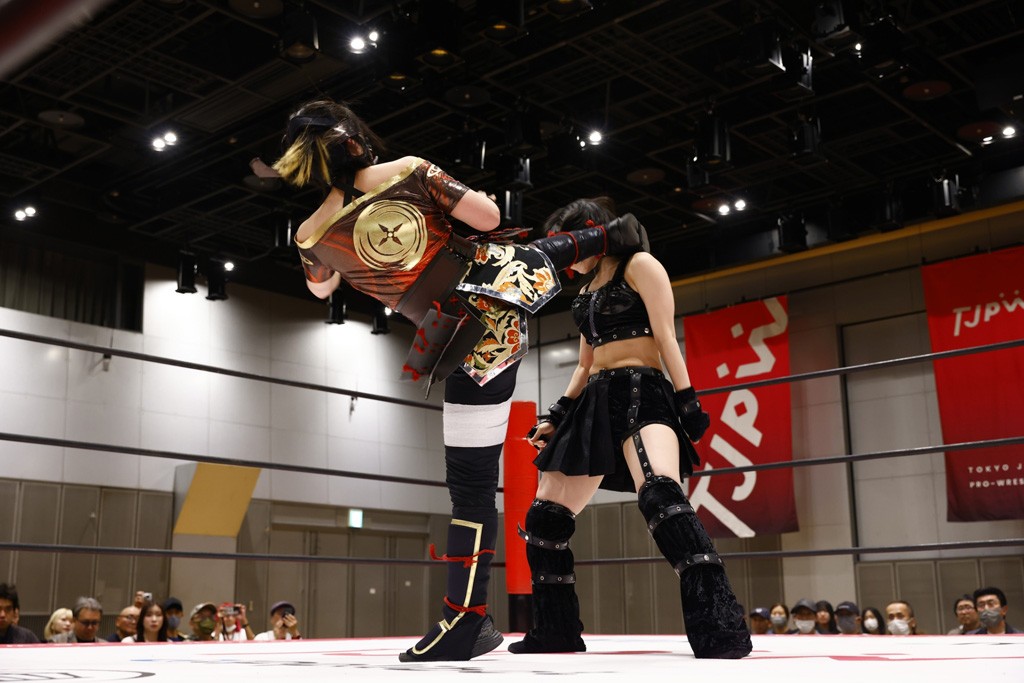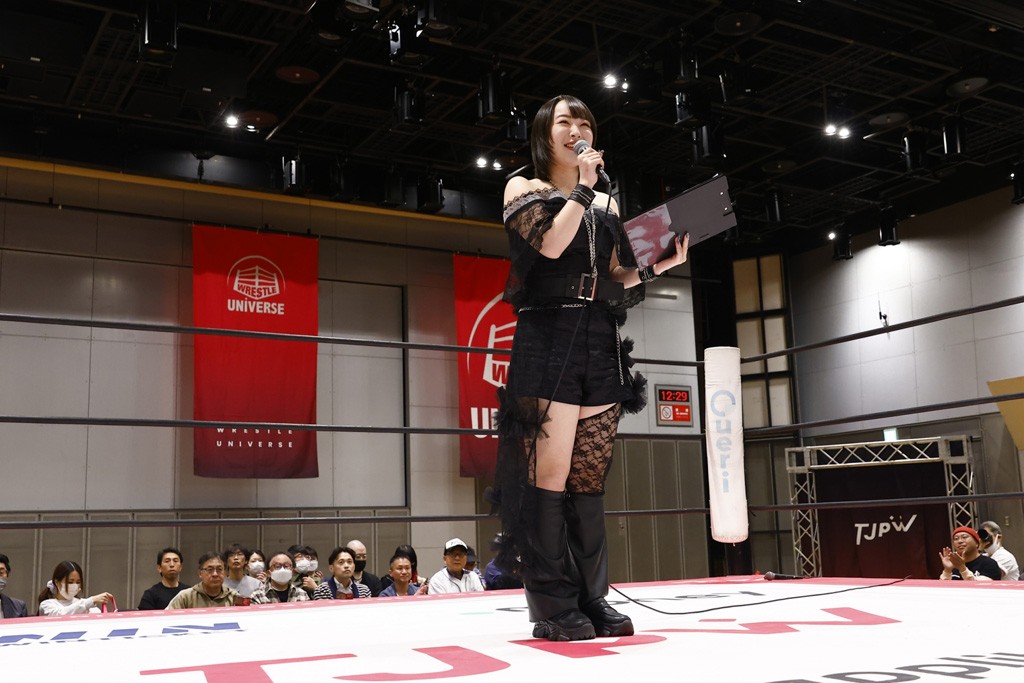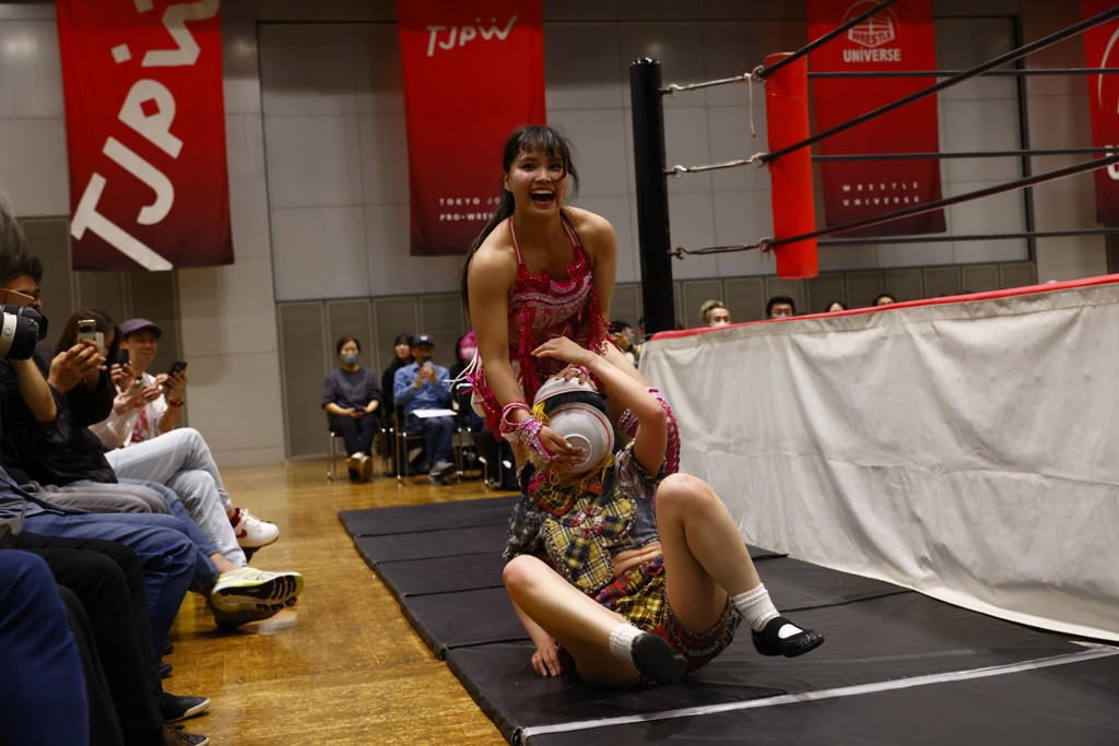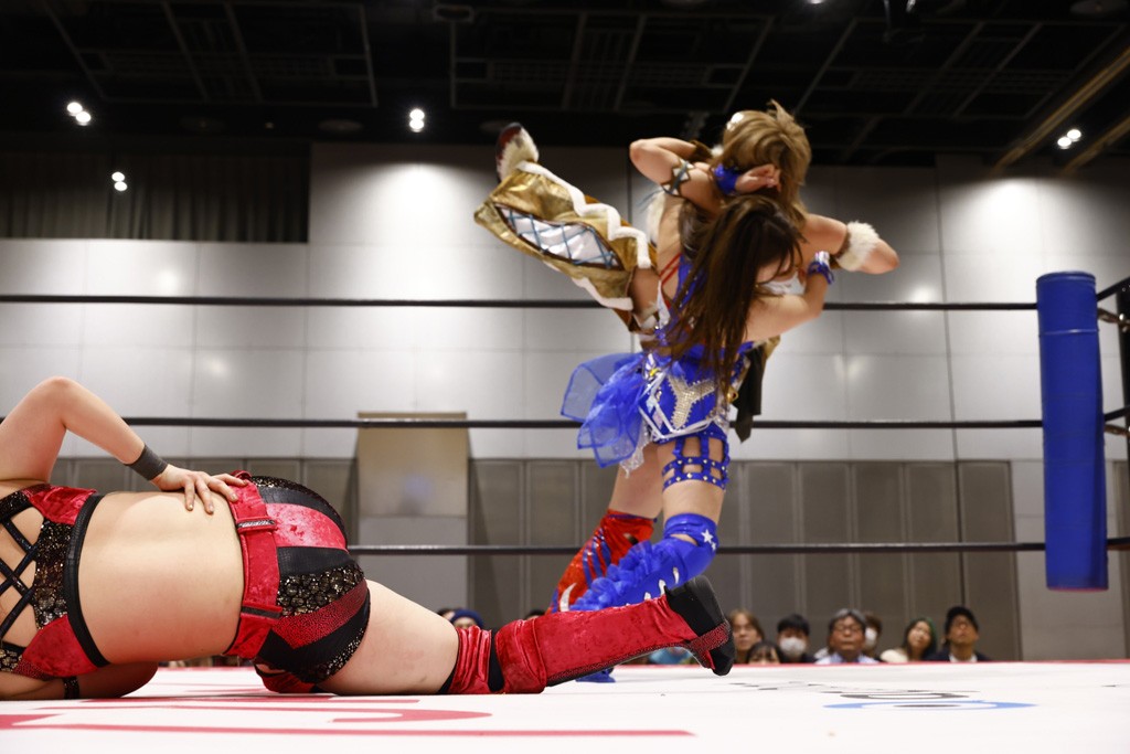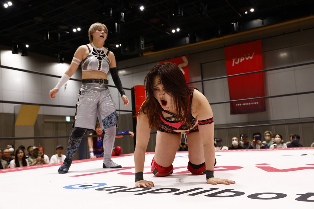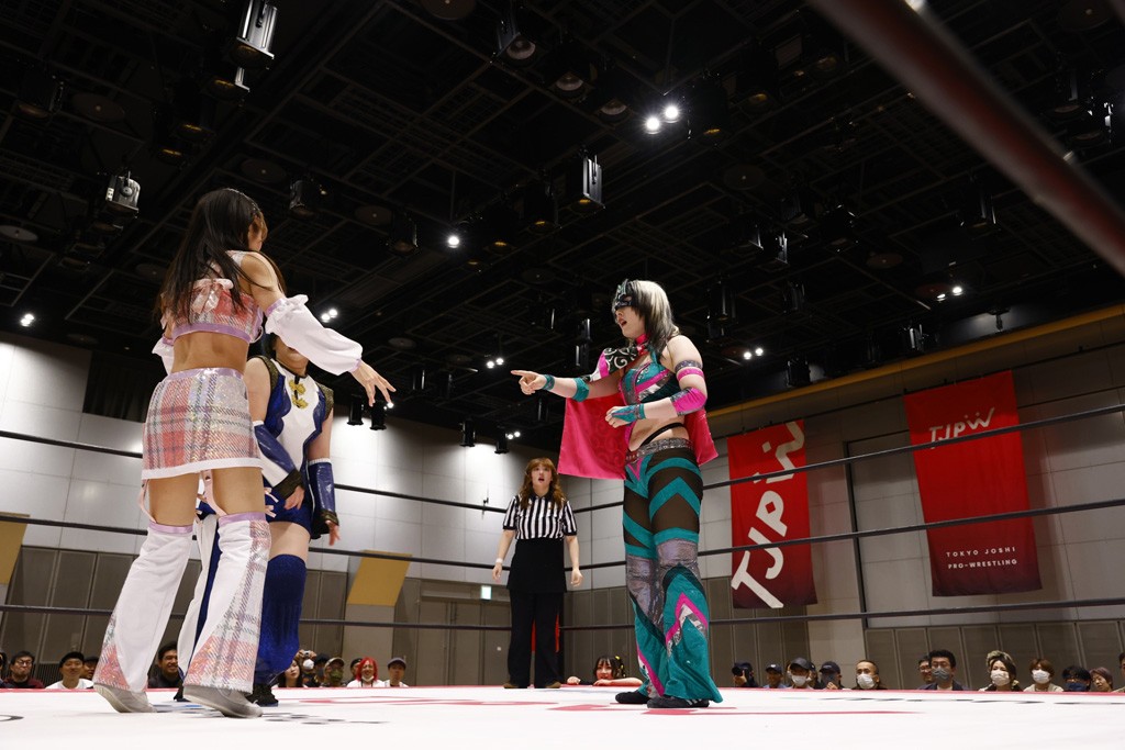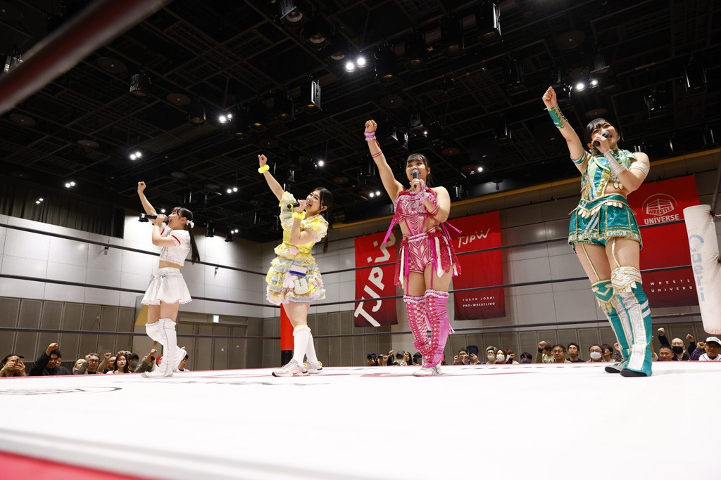 芦田 福岡ありがとうございました。無事私たち人が勝てていい連戦の締めになりましたね。そしてこれが挑戦権を懸けた5WAYにつながるわけですが、私の意気込み言ってもいいですか? 私はもともと東女に入ってから、このIPのベルトを一番最初に挑戦するベルトにしたかったし、一番最初に腰に巻くベルトにしたかったんです。それでこの前アメリカ遠征も経験させてもらって、やっぱり私はあのIPのベルトを巻いて、海外で試合をしまくってしまくってしまくって、東京女子をもっと世界的に有名にしたいという気持ちが強くなったので、今回、IPのベルトに挑戦するのは私です。