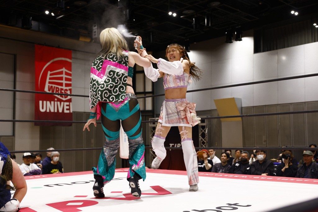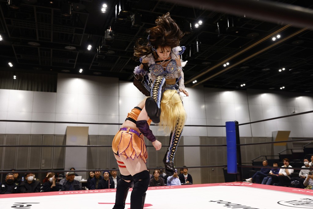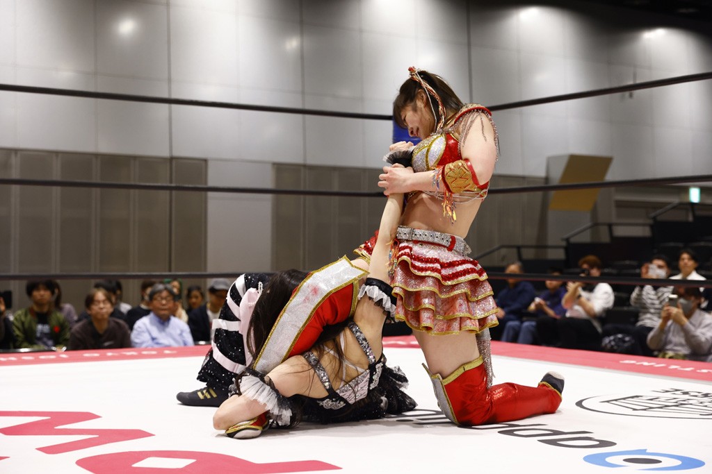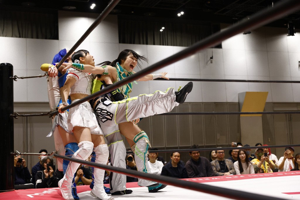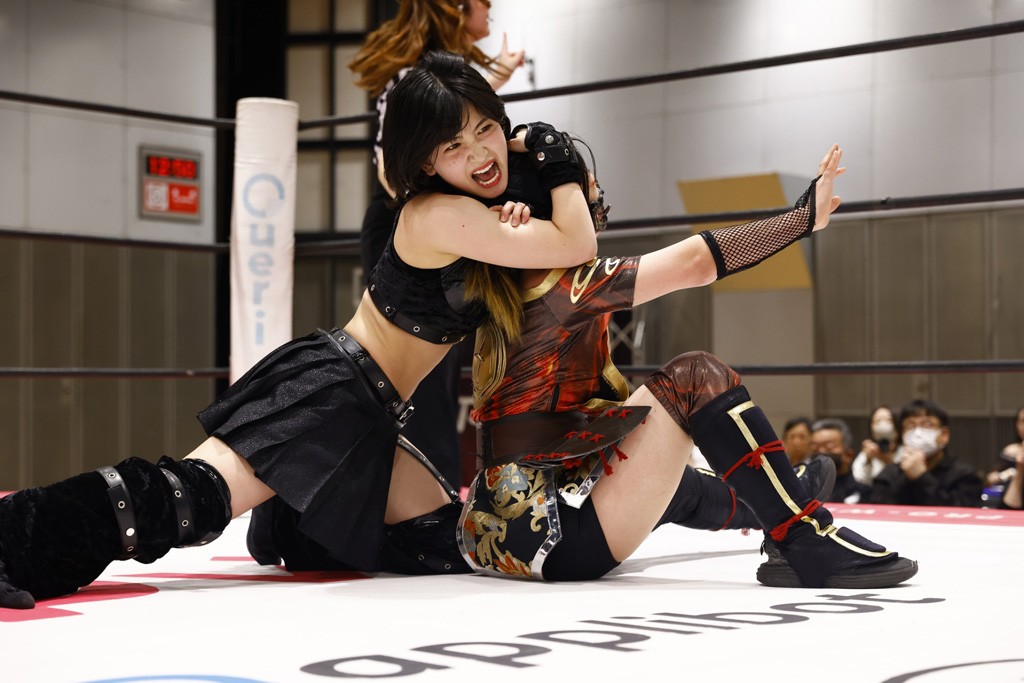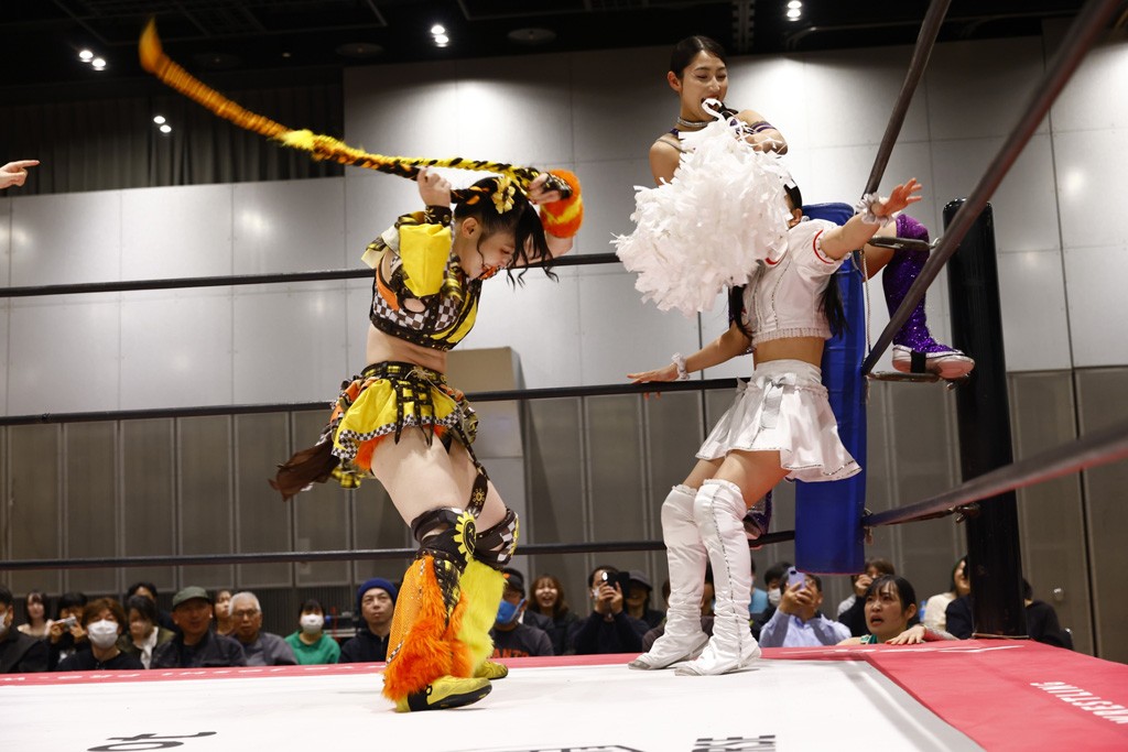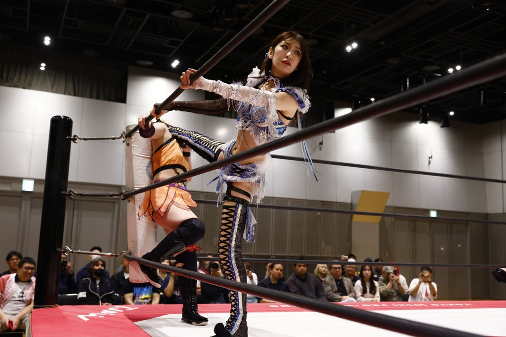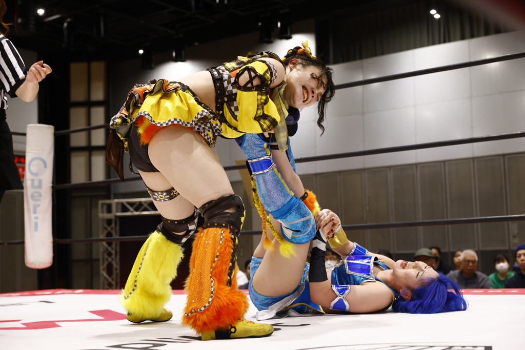 現インター王者の鈴芽と、5・4後楽園で4・16ラスベガスでの鈴芽vsハットリの勝者の持つインター王座の挑戦権を懸けて4・8上野の5WAYマッチで激突するハル、汐珠、HIMAWARI、志乃、芦田が加わった6人タッグマッチ。先発はハルと志乃。志乃がアームホイップからドロップキックを放つと観光案内に芦田のチアが加わるというにぎやかな展開も、3人の攻撃は鈴芽、ハル、汐珠に切り返されてしまう。志乃も汐珠を相手コーナーに運んで芦田とのタッチに成功。芦田のポンポンにHIMAWARIのロングヘアのムチ攻撃というよくわからない連係が続いて汐珠がローンバトル。ピンチの汐珠は志乃に向き直り式ミサイルキックを決めて鈴芽とタッチ。鈴芽は志乃にドロップキック。志乃の丸め込むも切り返して低空ドロップキックを決める。志乃は向かってきた鈴芽にスリーパー。そのまま自陣コーナーに運んで芦田と交替。芦田がY字ギロチンもカウント2。鈴芽はハイキックをかわしてフェースクラッシャー。替わったハルがセカンドロープから向き直り式ドロップキックを決める。芦田も向かってきたハルを前蹴りで止めてY字ギロチン。Xファクターから替わったHIMAWARIがお姫様落としもハルが切り返して押さえ込む。カウント2で返したHIMAWARIがローリングネックブリーカーからお姫様落とし。しかしカウント2。逆片エビかはハルが切り返してストレート・アームバー。HIMAWARIがこれを逆片エビで切り返す。汐珠のカットから混戦に。最後はHIMAWARIがハルにサン・フラワーテンペストを決めてフォール勝ち。