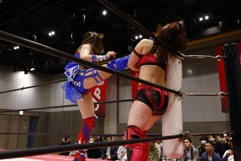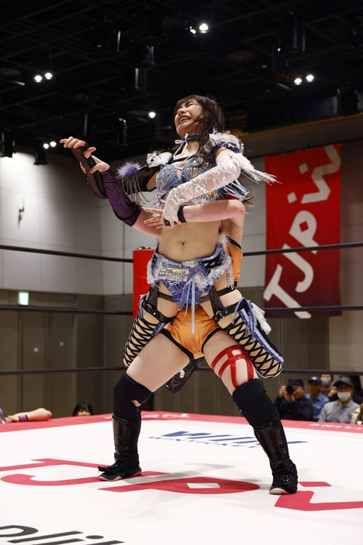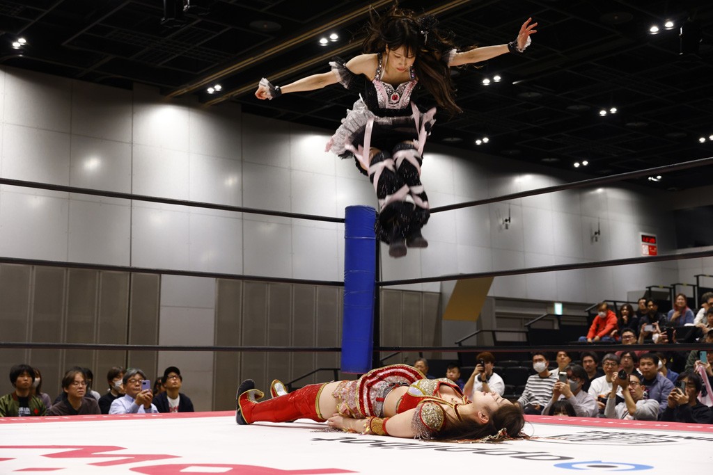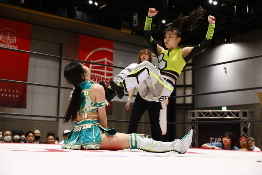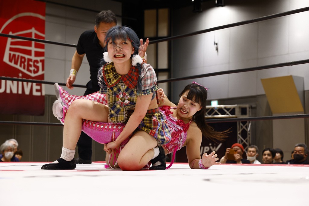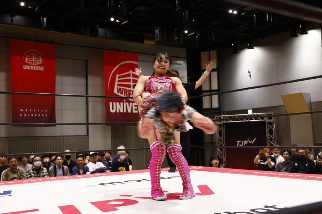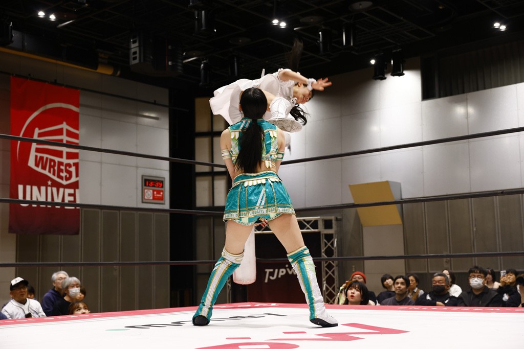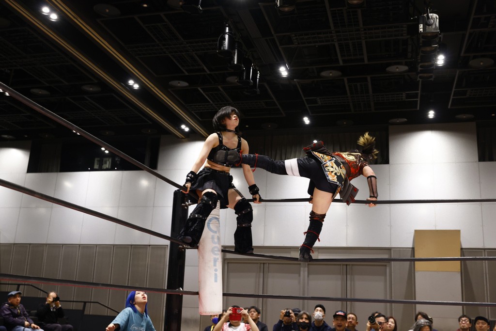 現インター王者の鈴芽と、5・4後楽園で4・16ラスベガスでの鈴芽vsハットリの勝者の持つインター王座の挑戦権を懸けて4・8上野の5WAYマッチで激突するハル、汐珠、HIMAWARI、志乃、芦田が加わった6人タッグマッチ。先発はハルと志乃。志乃がアームホイップからドロップキックを放つと観光案内に芦田のチアが加わるというにぎやかな展開も、3人の攻撃は鈴芽、ハル、汐珠に切り返されてしまう。志乃も汐珠を相手コーナーに運んで芦田とのタッチに成功。芦田のポンポンにHIMAWARIのロングヘアのムチ攻撃というよくわからない連係が続いて汐珠がローンバトル。ピンチの汐珠は志乃に向き直り式ミサイルキックを決めて鈴芽とタッチ。鈴芽は志乃にドロップキック。志乃の丸め込むも切り返して低空ドロップキックを決める。志乃は向かってきた鈴芽にスリーパー。そのまま自陣コーナーに運んで芦田と交替。芦田がY字ギロチンもカウント2。鈴芽はハイキックをかわしてフェースクラッシャー。替わったハルがセカンドロープから向き直り式ドロップキックを決める。芦田も向かってきたハルを前蹴りで止めてY字ギロチン。Xファクターから替わったHIMAWARIがお姫様落としもハルが切り返して押さえ込む。カウント2で返したHIMAWARIがローリングネックブリーカーからお姫様落とし。しかしカウント2。逆片エビかはハルが切り返してストレート・アームバー。HIMAWARIがこれを逆片エビで切り返す。汐珠のカットから混戦に。最後はHIMAWARIがハルにサン・フラワーテンペストを決めてフォール勝ち。