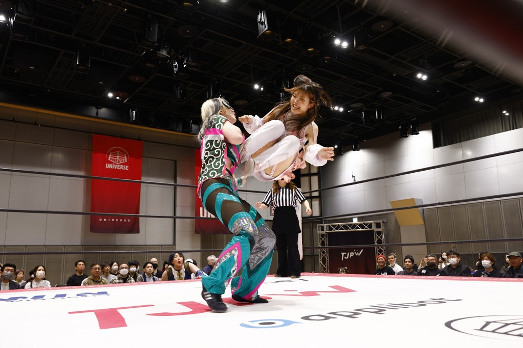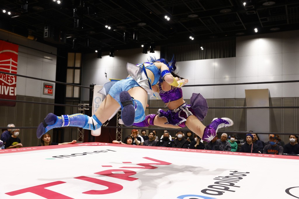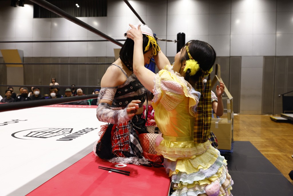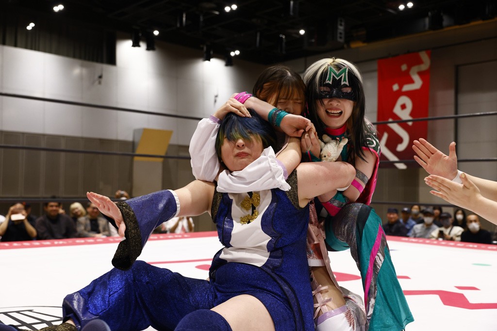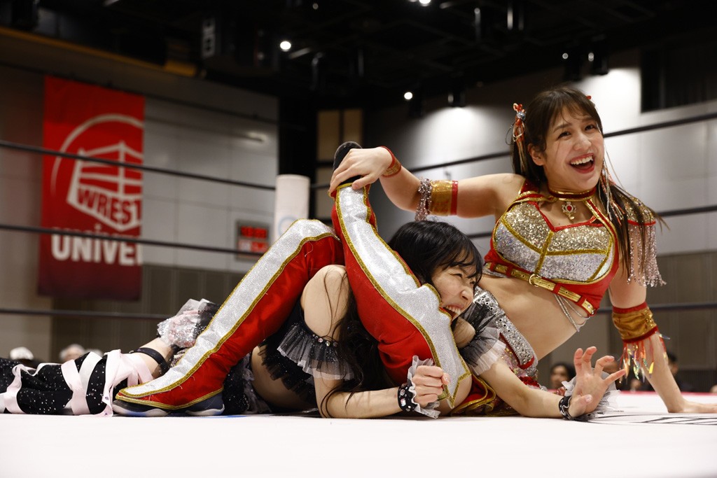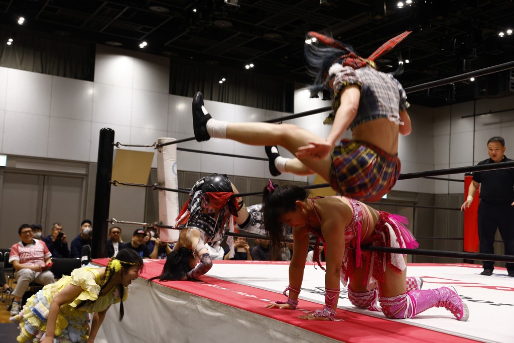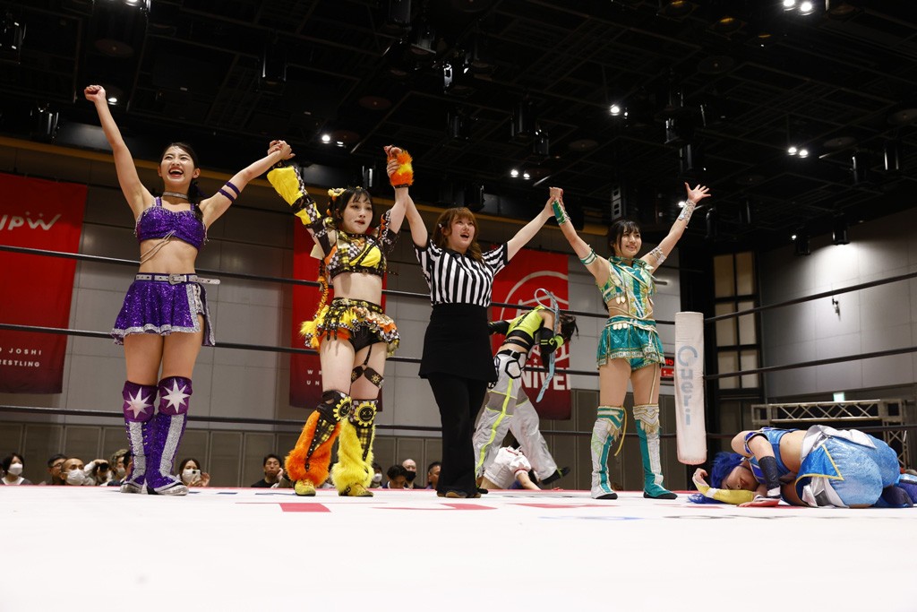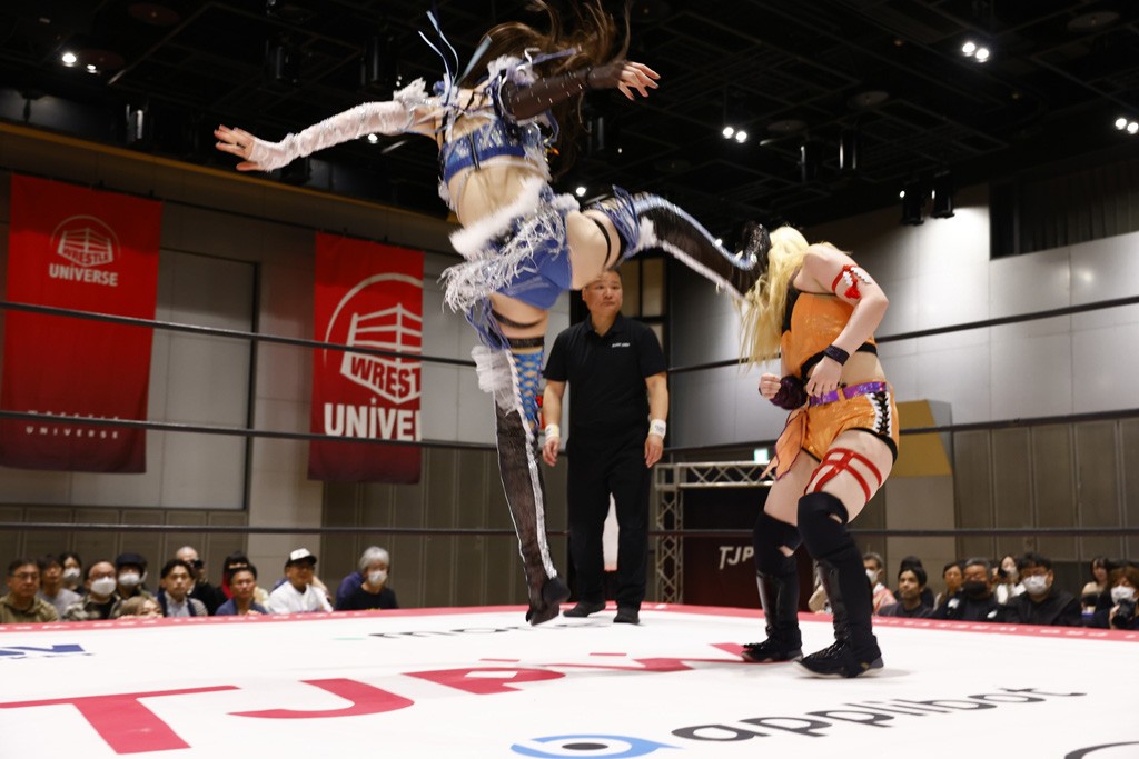 現インター王者の鈴芽と、5・4後楽園で4・16ラスベガスでの鈴芽vsハットリの勝者の持つインター王座の挑戦権を懸けて4・8上野の5WAYマッチで激突するハル、汐珠、HIMAWARI、志乃、芦田が加わった6人タッグマッチ。先発はハルと志乃。志乃がアームホイップからドロップキックを放つと観光案内に芦田のチアが加わるというにぎやかな展開も、3人の攻撃は鈴芽、ハル、汐珠に切り返されてしまう。志乃も汐珠を相手コーナーに運んで芦田とのタッチに成功。芦田のポンポンにHIMAWARIのロングヘアのムチ攻撃というよくわからない連係が続いて汐珠がローンバトル。ピンチの汐珠は志乃に向き直り式ミサイルキックを決めて鈴芽とタッチ。鈴芽は志乃にドロップキック。志乃の丸め込むも切り返して低空ドロップキックを決める。志乃は向かってきた鈴芽にスリーパー。そのまま自陣コーナーに運んで芦田と交替。芦田がY字ギロチンもカウント2。鈴芽はハイキックをかわしてフェースクラッシャー。替わったハルがセカンドロープから向き直り式ドロップキックを決める。芦田も向かってきたハルを前蹴りで止めてY字ギロチン。Xファクターから替わったHIMAWARIがお姫様落としもハルが切り返して押さえ込む。カウント2で返したHIMAWARIがローリングネックブリーカーからお姫様落とし。しかしカウント2。逆片エビかはハルが切り返してストレート・アームバー。HIMAWARIがこれを逆片エビで切り返す。汐珠のカットから混戦に。最後はHIMAWARIがハルにサン・フラワーテンペストを決めてフォール勝ち。