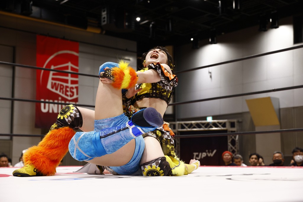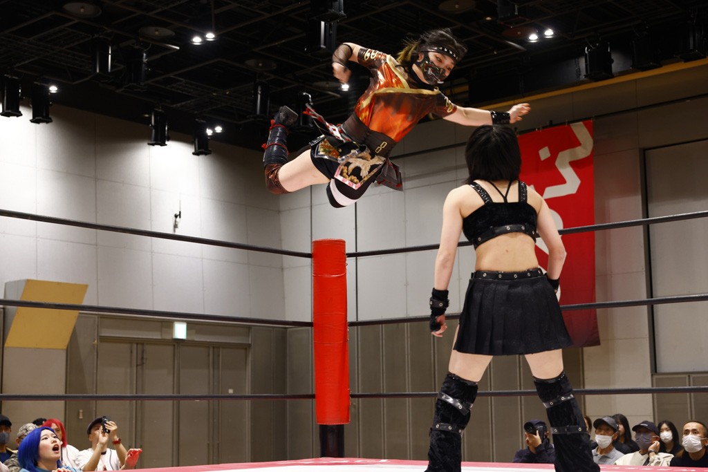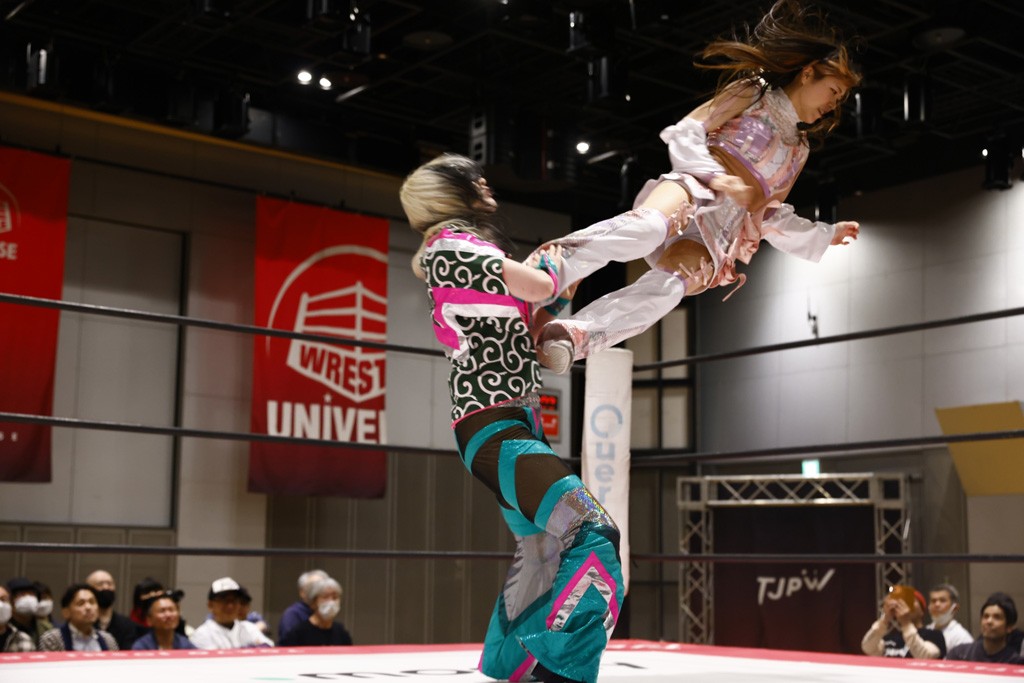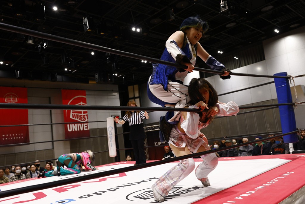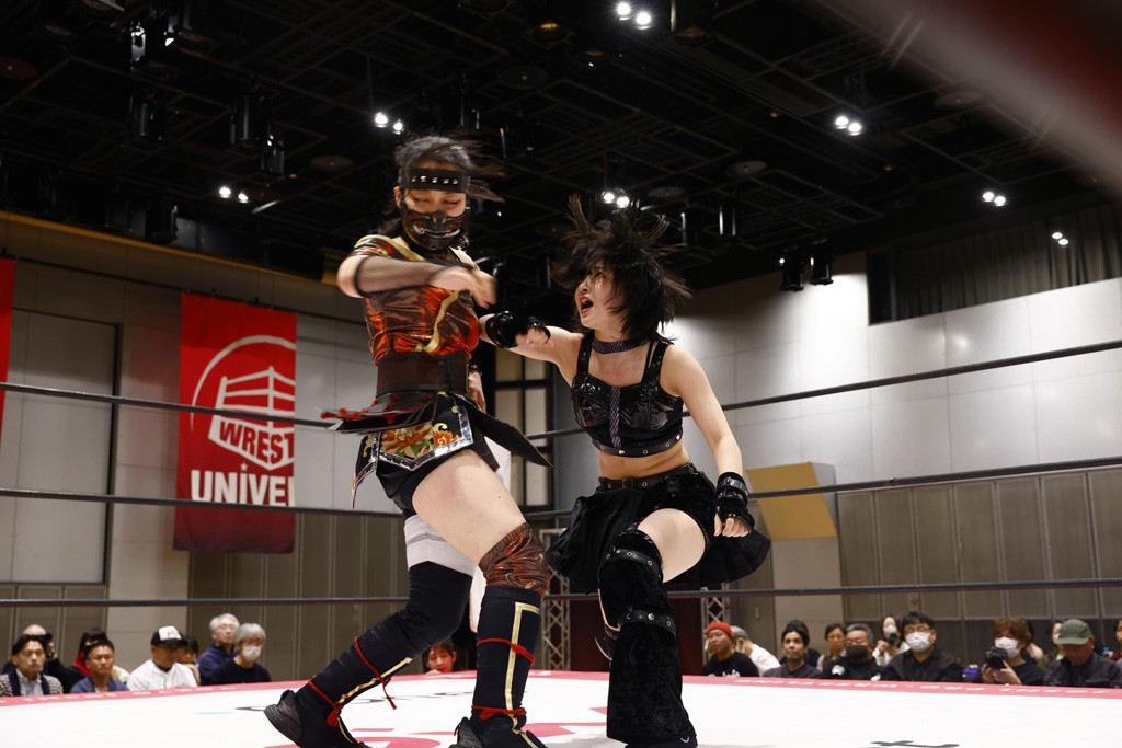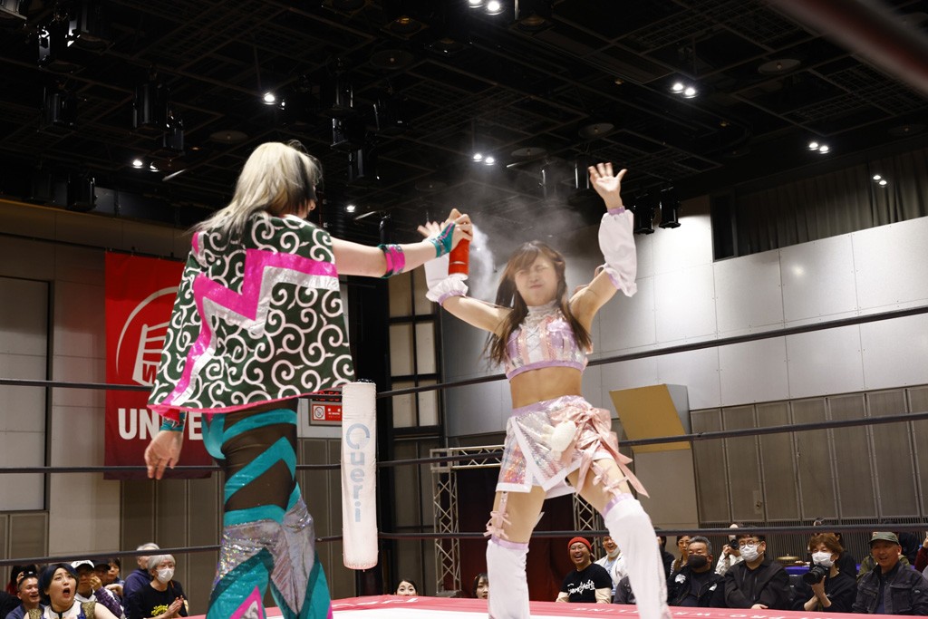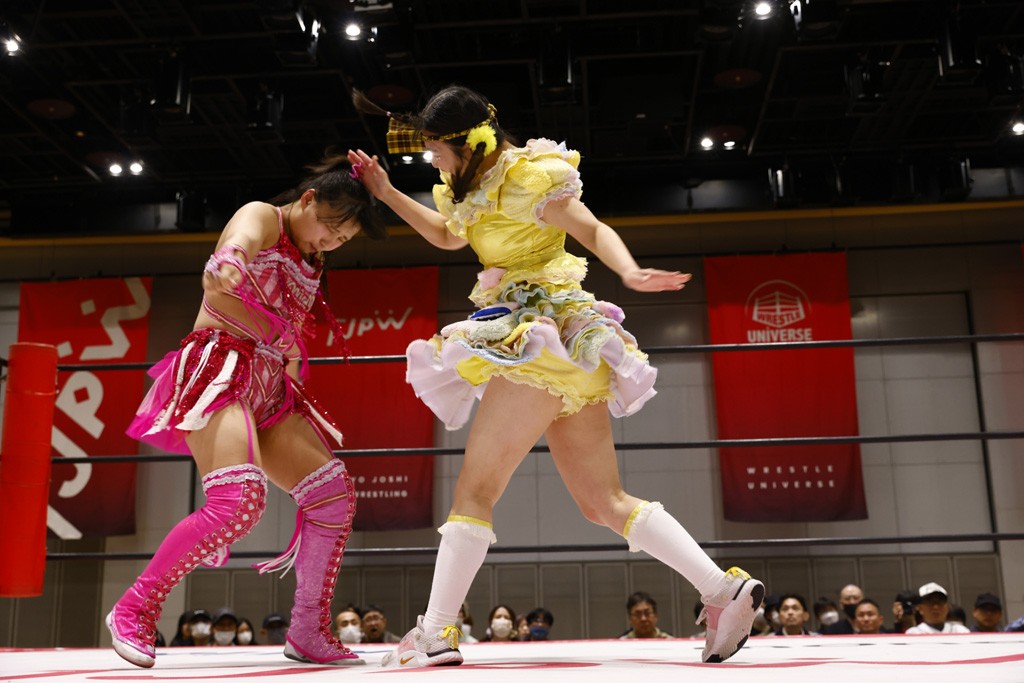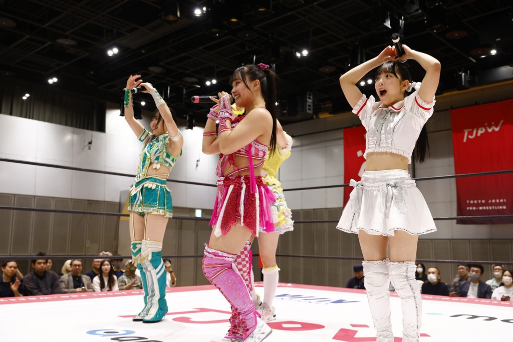 現インター王者の鈴芽と、5・4後楽園で4・16ラスベガスでの鈴芽vsハットリの勝者の持つインター王座の挑戦権を懸けて4・8上野の5WAYマッチで激突するハル、汐珠、HIMAWARI、志乃、芦田が加わった6人タッグマッチ。先発はハルと志乃。志乃がアームホイップからドロップキックを放つと観光案内に芦田のチアが加わるというにぎやかな展開も、3人の攻撃は鈴芽、ハル、汐珠に切り返されてしまう。志乃も汐珠を相手コーナーに運んで芦田とのタッチに成功。芦田のポンポンにHIMAWARIのロングヘアのムチ攻撃というよくわからない連係が続いて汐珠がローンバトル。ピンチの汐珠は志乃に向き直り式ミサイルキックを決めて鈴芽とタッチ。鈴芽は志乃にドロップキック。志乃の丸め込むも切り返して低空ドロップキックを決める。志乃は向かってきた鈴芽にスリーパー。そのまま自陣コーナーに運んで芦田と交替。芦田がY字ギロチンもカウント2。鈴芽はハイキックをかわしてフェースクラッシャー。替わったハルがセカンドロープから向き直り式ドロップキックを決める。芦田も向かってきたハルを前蹴りで止めてY字ギロチン。Xファクターから替わったHIMAWARIがお姫様落としもハルが切り返して押さえ込む。カウント2で返したHIMAWARIがローリングネックブリーカーからお姫様落とし。しかしカウント2。逆片エビかはハルが切り返してストレート・アームバー。HIMAWARIがこれを逆片エビで切り返す。汐珠のカットから混戦に。最後はHIMAWARIがハルにサン・フラワーテンペストを決めてフォール勝ち。
