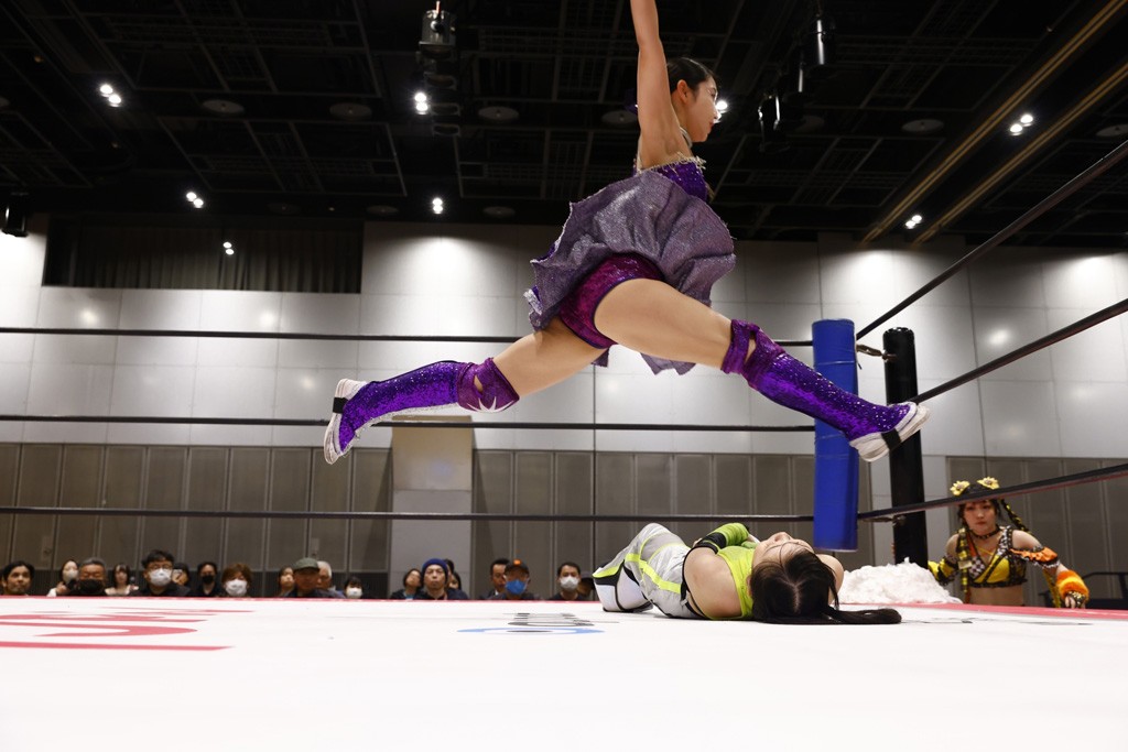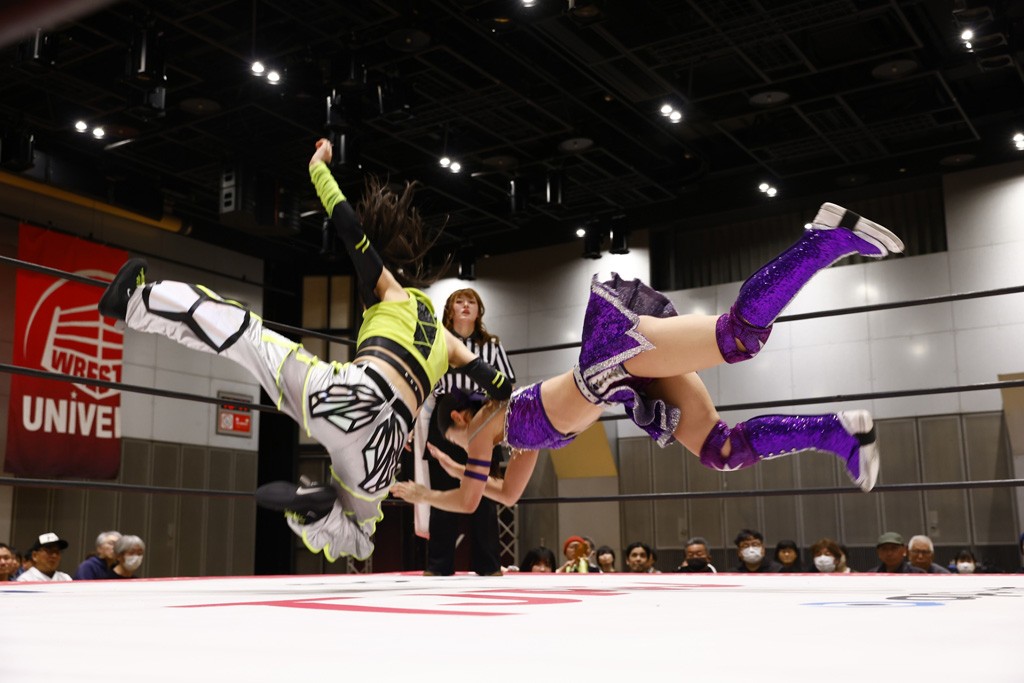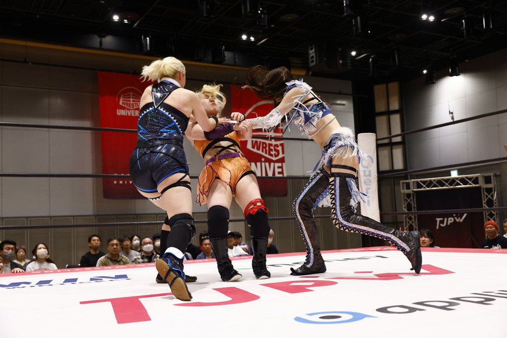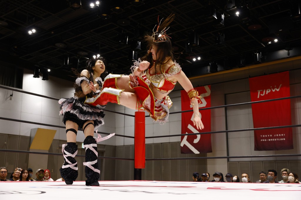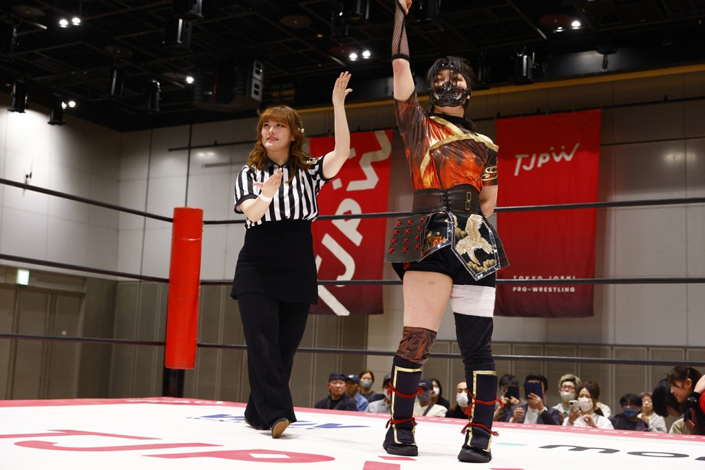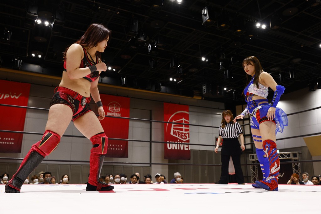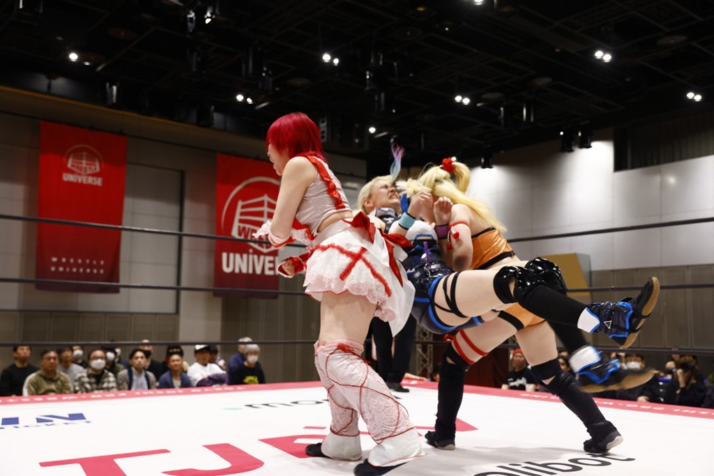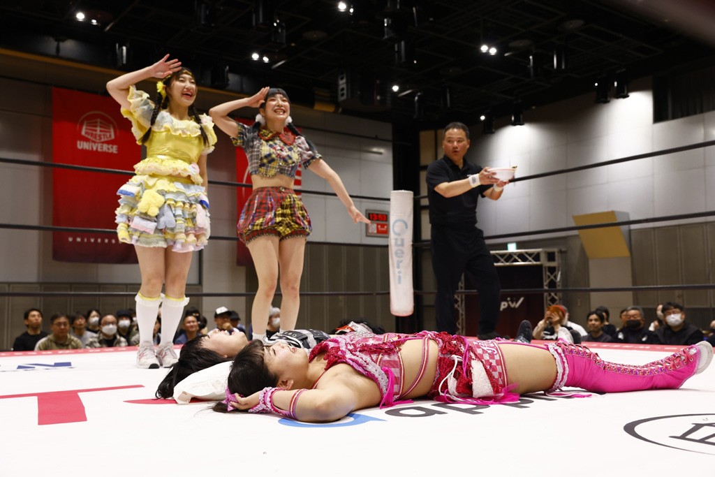 現インター王者の鈴芽と、5・4後楽園で4・16ラスベガスでの鈴芽vsハットリの勝者の持つインター王座の挑戦権を懸けて4・8上野の5WAYマッチで激突するハル、汐珠、HIMAWARI、志乃、芦田が加わった6人タッグマッチ。先発はハルと志乃。志乃がアームホイップからドロップキックを放つと観光案内に芦田のチアが加わるというにぎやかな展開も、3人の攻撃は鈴芽、ハル、汐珠に切り返されてしまう。志乃も汐珠を相手コーナーに運んで芦田とのタッチに成功。芦田のポンポンにHIMAWARIのロングヘアのムチ攻撃というよくわからない連係が続いて汐珠がローンバトル。ピンチの汐珠は志乃に向き直り式ミサイルキックを決めて鈴芽とタッチ。鈴芽は志乃にドロップキック。志乃の丸め込むも切り返して低空ドロップキックを決める。志乃は向かってきた鈴芽にスリーパー。そのまま自陣コーナーに運んで芦田と交替。芦田がY字ギロチンもカウント2。鈴芽はハイキックをかわしてフェースクラッシャー。替わったハルがセカンドロープから向き直り式ドロップキックを決める。芦田も向かってきたハルを前蹴りで止めてY字ギロチン。Xファクターから替わったHIMAWARIがお姫様落としもハルが切り返して押さえ込む。カウント2で返したHIMAWARIがローリングネックブリーカーからお姫様落とし。しかしカウント2。逆片エビかはハルが切り返してストレート・アームバー。HIMAWARIがこれを逆片エビで切り返す。汐珠のカットから混戦に。最後はHIMAWARIがハルにサン・フラワーテンペストを決めてフォール勝ち。