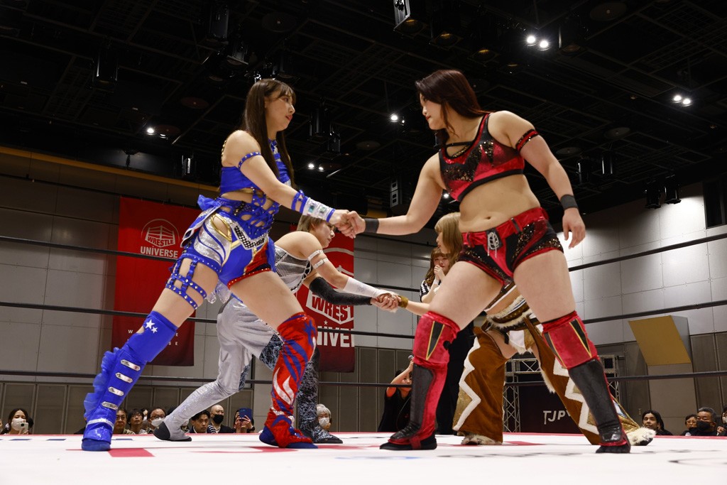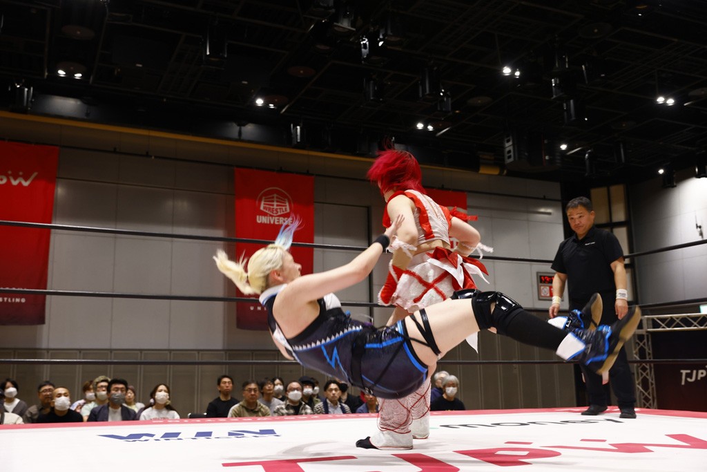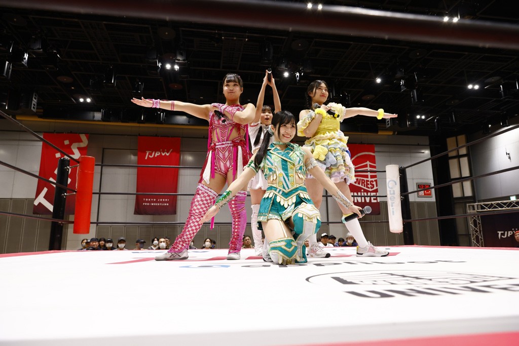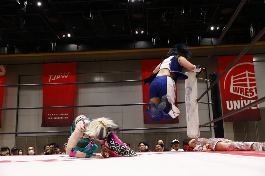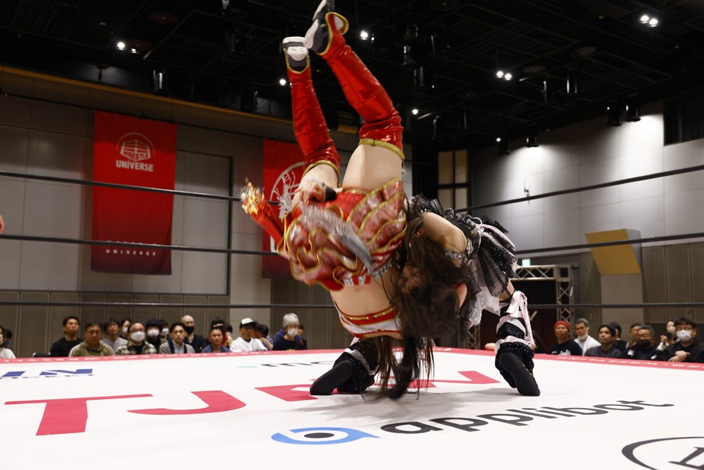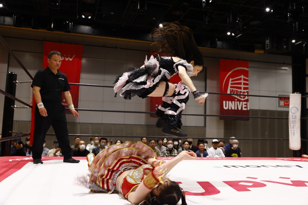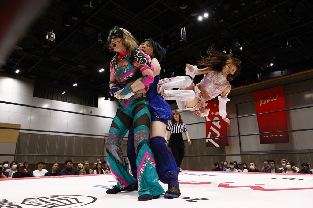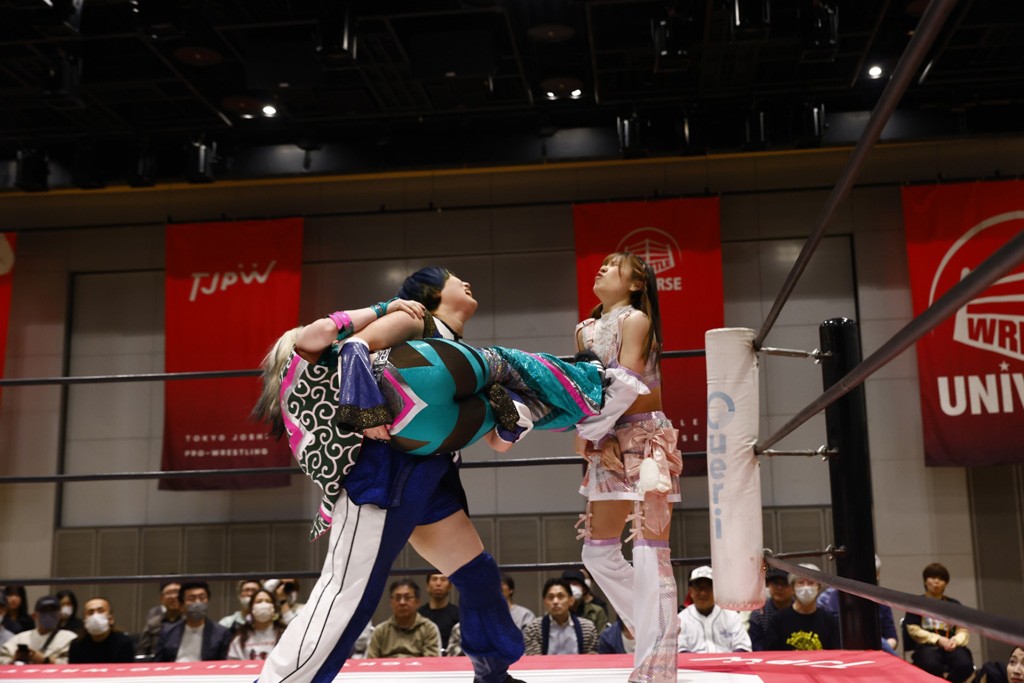 現インター王者の鈴芽と、5・4後楽園で4・16ラスベガスでの鈴芽vsハットリの勝者の持つインター王座の挑戦権を懸けて4・8上野の5WAYマッチで激突するハル、汐珠、HIMAWARI、志乃、芦田が加わった6人タッグマッチ。先発はハルと志乃。志乃がアームホイップからドロップキックを放つと観光案内に芦田のチアが加わるというにぎやかな展開も、3人の攻撃は鈴芽、ハル、汐珠に切り返されてしまう。志乃も汐珠を相手コーナーに運んで芦田とのタッチに成功。芦田のポンポンにHIMAWARIのロングヘアのムチ攻撃というよくわからない連係が続いて汐珠がローンバトル。ピンチの汐珠は志乃に向き直り式ミサイルキックを決めて鈴芽とタッチ。鈴芽は志乃にドロップキック。志乃の丸め込むも切り返して低空ドロップキックを決める。志乃は向かってきた鈴芽にスリーパー。そのまま自陣コーナーに運んで芦田と交替。芦田がY字ギロチンもカウント2。鈴芽はハイキックをかわしてフェースクラッシャー。替わったハルがセカンドロープから向き直り式ドロップキックを決める。芦田も向かってきたハルを前蹴りで止めてY字ギロチン。Xファクターから替わったHIMAWARIがお姫様落としもハルが切り返して押さえ込む。カウント2で返したHIMAWARIがローリングネックブリーカーからお姫様落とし。しかしカウント2。逆片エビかはハルが切り返してストレート・アームバー。HIMAWARIがこれを逆片エビで切り返す。汐珠のカットから混戦に。最後はHIMAWARIがハルにサン・フラワーテンペストを決めてフォール勝ち。