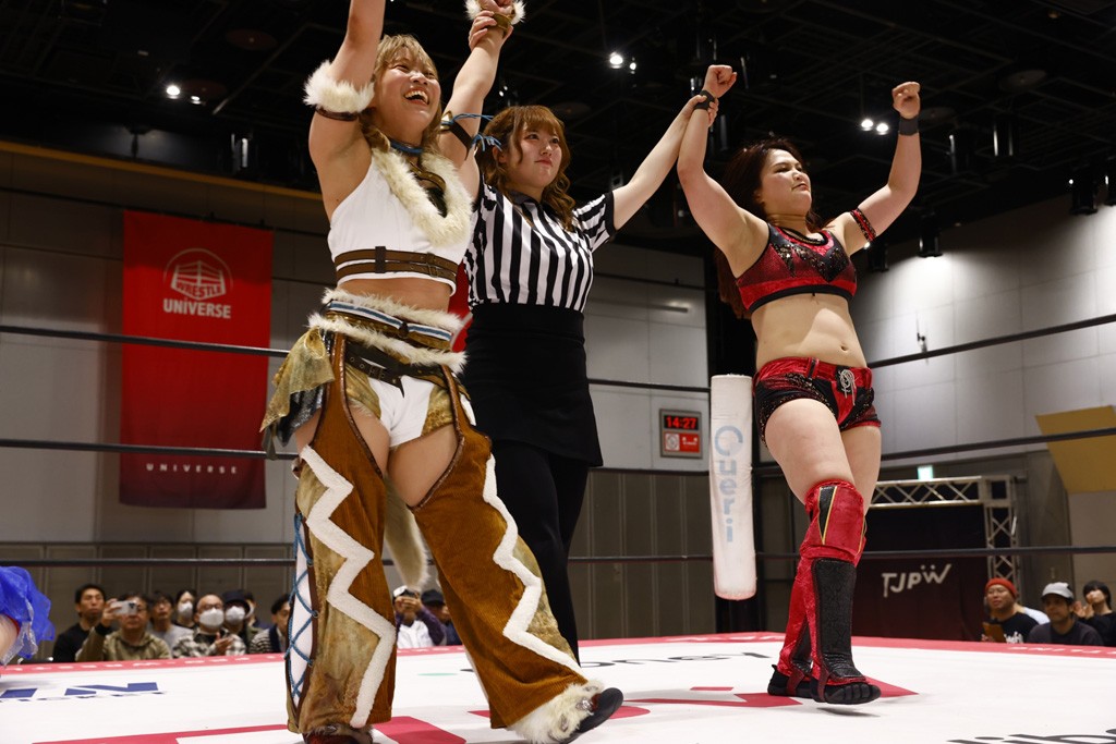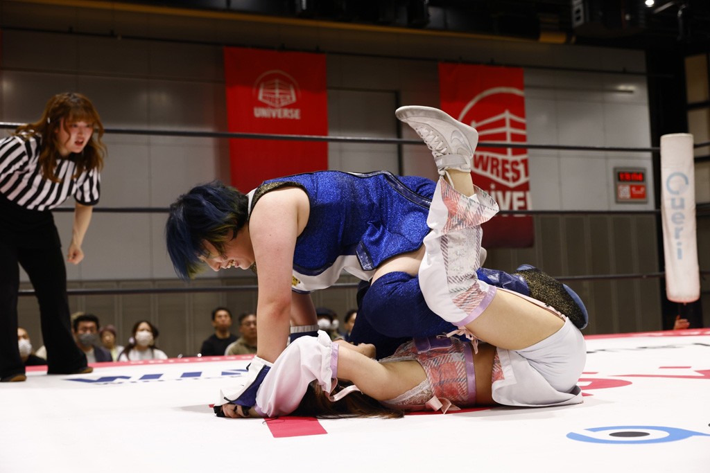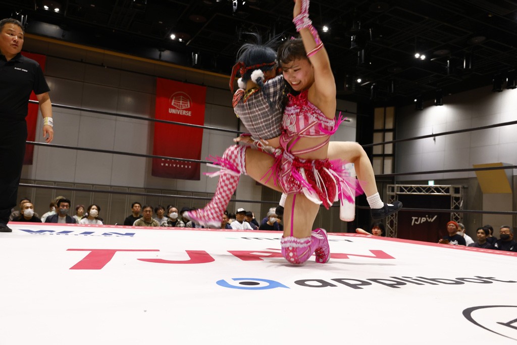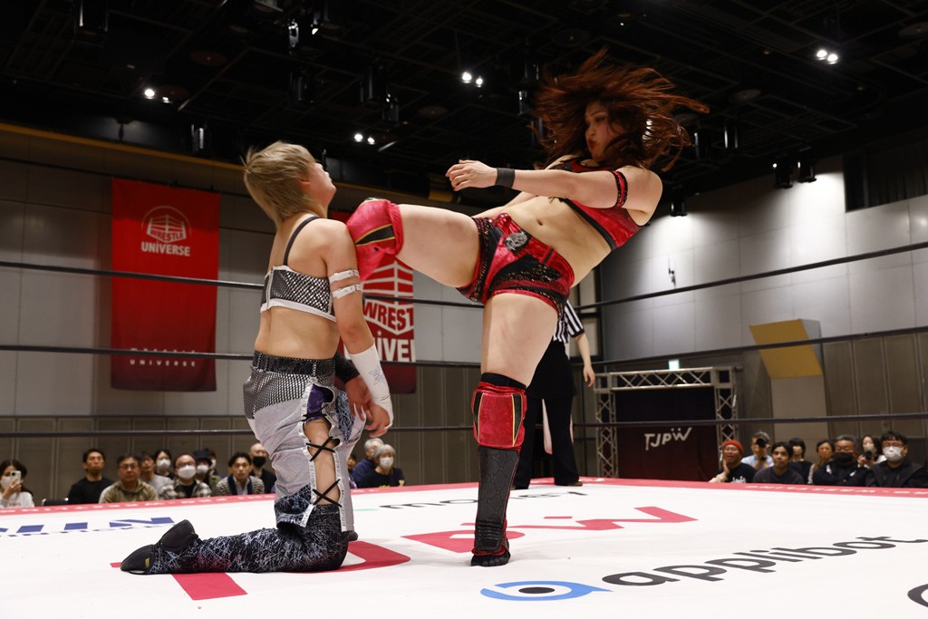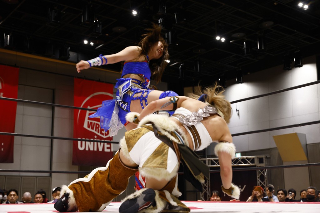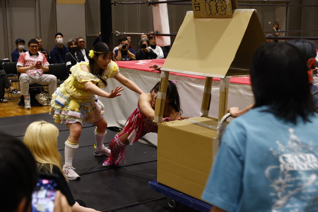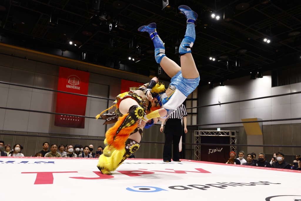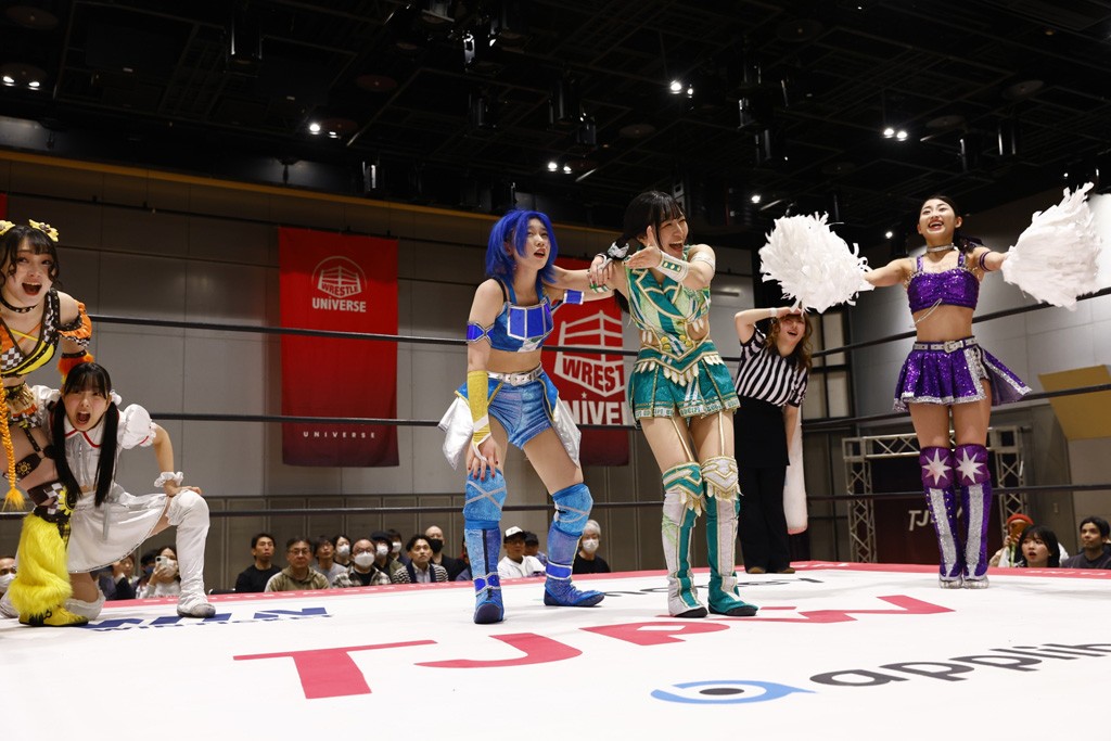 現インター王者の鈴芽と、5・4後楽園で4・16ラスベガスでの鈴芽vsハットリの勝者の持つインター王座の挑戦権を懸けて4・8上野の5WAYマッチで激突するハル、汐珠、HIMAWARI、志乃、芦田が加わった6人タッグマッチ。先発はハルと志乃。志乃がアームホイップからドロップキックを放つと観光案内に芦田のチアが加わるというにぎやかな展開も、3人の攻撃は鈴芽、ハル、汐珠に切り返されてしまう。志乃も汐珠を相手コーナーに運んで芦田とのタッチに成功。芦田のポンポンにHIMAWARIのロングヘアのムチ攻撃というよくわからない連係が続いて汐珠がローンバトル。ピンチの汐珠は志乃に向き直り式ミサイルキックを決めて鈴芽とタッチ。鈴芽は志乃にドロップキック。志乃の丸め込むも切り返して低空ドロップキックを決める。志乃は向かってきた鈴芽にスリーパー。そのまま自陣コーナーに運んで芦田と交替。芦田がY字ギロチンもカウント2。鈴芽はハイキックをかわしてフェースクラッシャー。替わったハルがセカンドロープから向き直り式ドロップキックを決める。芦田も向かってきたハルを前蹴りで止めてY字ギロチン。Xファクターから替わったHIMAWARIがお姫様落としもハルが切り返して押さえ込む。カウント2で返したHIMAWARIがローリングネックブリーカーからお姫様落とし。しかしカウント2。逆片エビかはハルが切り返してストレート・アームバー。HIMAWARIがこれを逆片エビで切り返す。汐珠のカットから混戦に。最後はHIMAWARIがハルにサン・フラワーテンペストを決めてフォール勝ち。