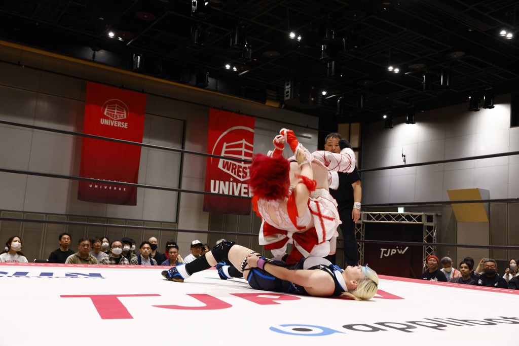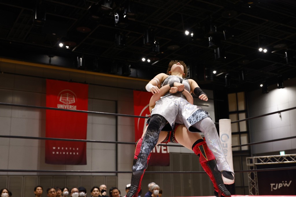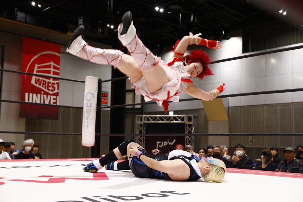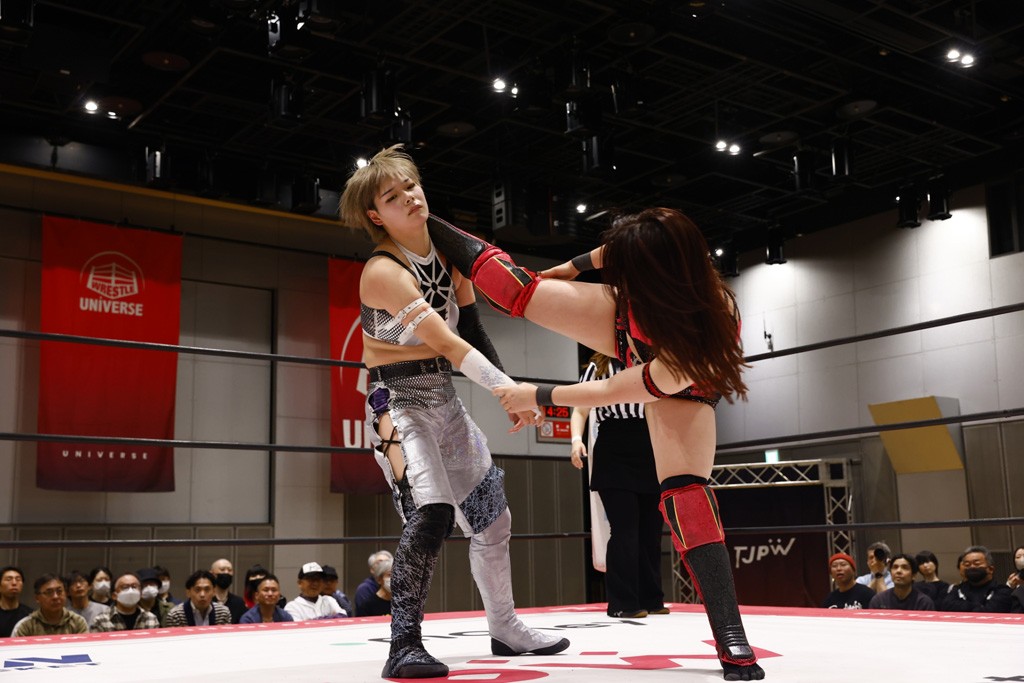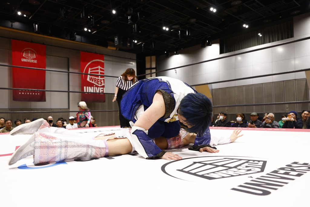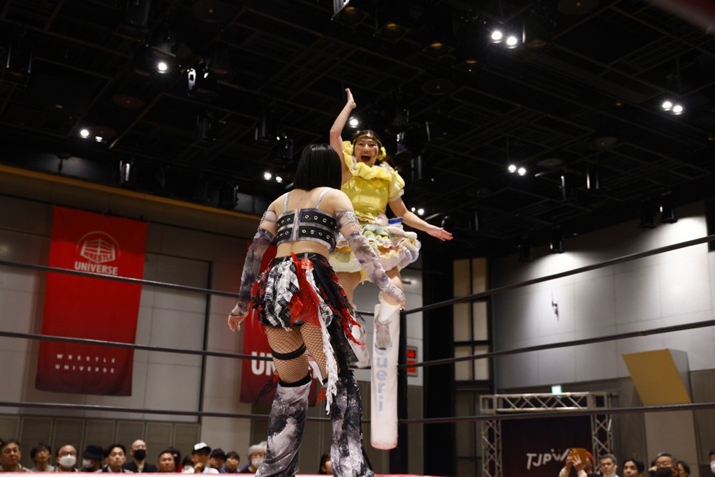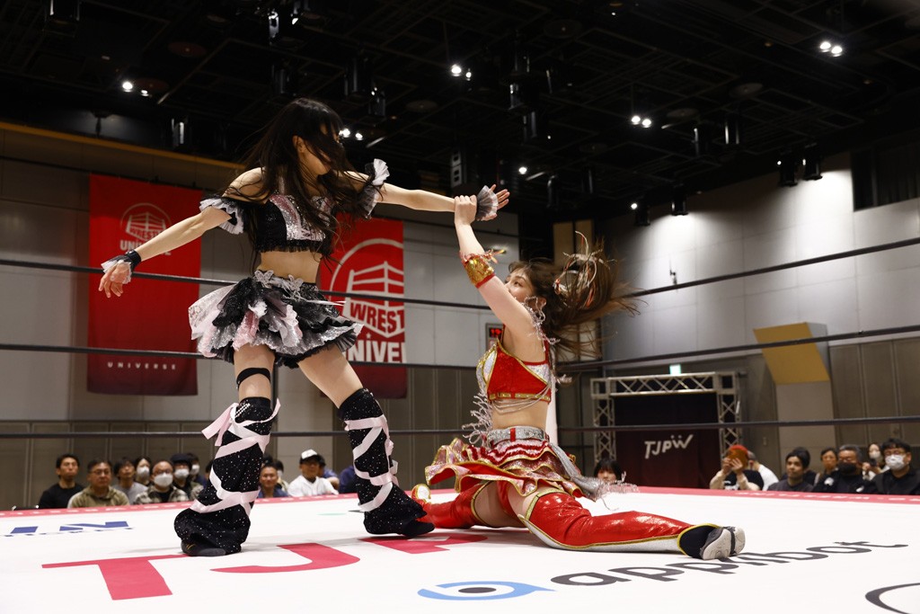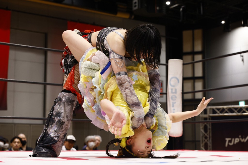 現インター王者の鈴芽と、5・4後楽園で4・16ラスベガスでの鈴芽vsハットリの勝者の持つインター王座の挑戦権を懸けて4・8上野の5WAYマッチで激突するハル、汐珠、HIMAWARI、志乃、芦田が加わった6人タッグマッチ。先発はハルと志乃。志乃がアームホイップからドロップキックを放つと観光案内に芦田のチアが加わるというにぎやかな展開も、3人の攻撃は鈴芽、ハル、汐珠に切り返されてしまう。志乃も汐珠を相手コーナーに運んで芦田とのタッチに成功。芦田のポンポンにHIMAWARIのロングヘアのムチ攻撃というよくわからない連係が続いて汐珠がローンバトル。ピンチの汐珠は志乃に向き直り式ミサイルキックを決めて鈴芽とタッチ。鈴芽は志乃にドロップキック。志乃の丸め込むも切り返して低空ドロップキックを決める。志乃は向かってきた鈴芽にスリーパー。そのまま自陣コーナーに運んで芦田と交替。芦田がY字ギロチンもカウント2。鈴芽はハイキックをかわしてフェースクラッシャー。替わったハルがセカンドロープから向き直り式ドロップキックを決める。芦田も向かってきたハルを前蹴りで止めてY字ギロチン。Xファクターから替わったHIMAWARIがお姫様落としもハルが切り返して押さえ込む。カウント2で返したHIMAWARIがローリングネックブリーカーからお姫様落とし。しかしカウント2。逆片エビかはハルが切り返してストレート・アームバー。HIMAWARIがこれを逆片エビで切り返す。汐珠のカットから混戦に。最後はHIMAWARIがハルにサン・フラワーテンペストを決めてフォール勝ち。