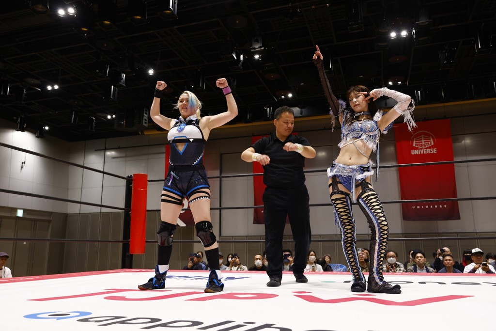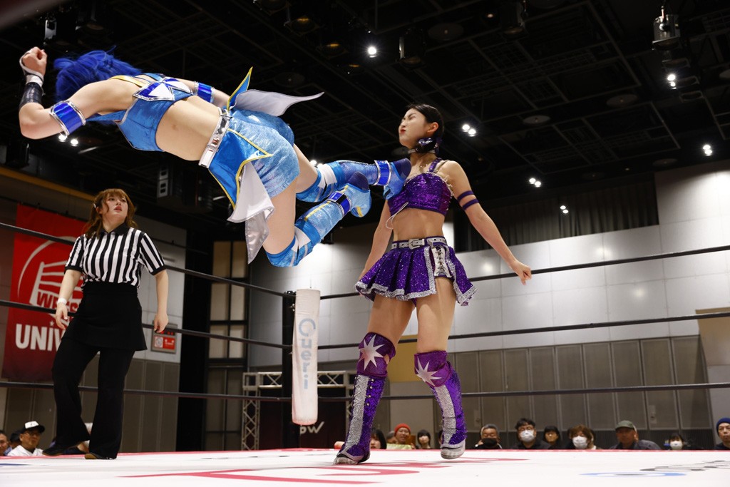汐珠 はい、突然巡ってきたこのベルトに挑戦できるチャンスが先輩方だらけの5WAYなんですけど、そんなの関係ないと思ってるし、もう汐珠はみんなビックリするくらいのビッグ・ビッグ・ビックリ・ミラクル? ビッグ・ミラクルを起こして、その後もビッグ・ビッグ・ミラクルを起こして、でっかい波に乗ってミラクルになります!