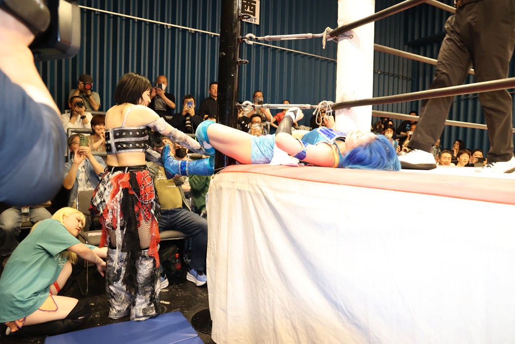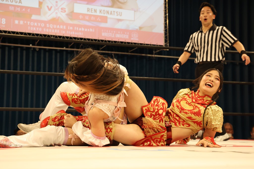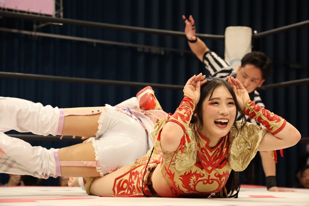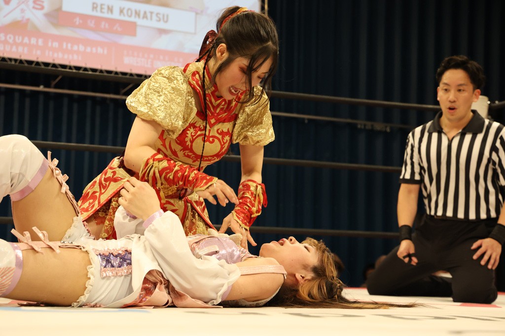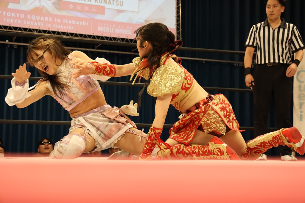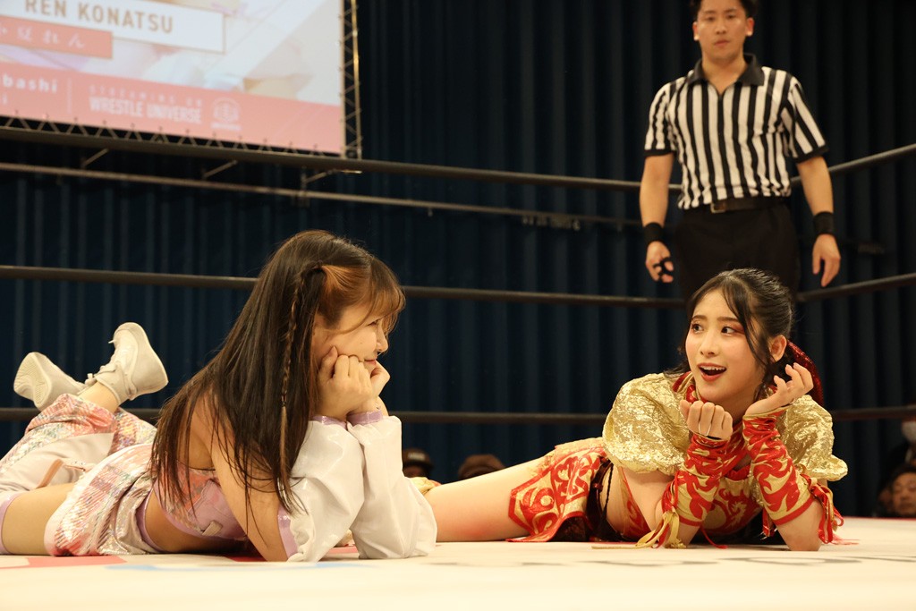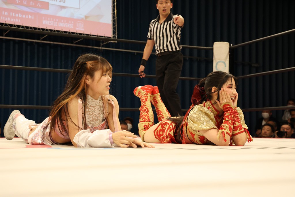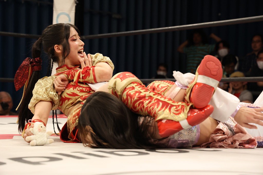 メイと小夏は昨年9月の大田区以来の対戦で初シングル。小夏の握手はメイが拒否して場内ブーイング。メイのダイヤル固めからのニコニコフォールに小夏もぶりっ子ポーズを見せるとメイは突き飛ばしエルボーの応酬。メイは小夏にアームツイストからフェースクラッシャー、さらに羽根折り固めを極めながら羊のぬいぐるみを奪って挑発。コーナーに羊をセットして小夏を投げんとするも小夏は叩きつけられることを拒否してエルボー連打。しかしメイはボディースラムを投げ返し、さらに羊を叩きつける。小夏は回転エビ固めからドロップキックで反撃。腕に噛みつくメイに小夏はドロップキックから串刺しドロップキック、ボディースラム、スリーパーと畳みかける。メイもサブミッションでやり返すが小夏がロープに足を伸ばす。ダイビング・フットスタンプは小夏が回避してオクラホマロール。カウント2で返されるとバンデーラから回転エビ固めもカウント2。こなつくらっしゅからひつじ座コメットを狙うが空を切るとメイがセカンドロープからの反転式フットスタンプ、そしてガトー・インビジブルでギブアップ勝ち。