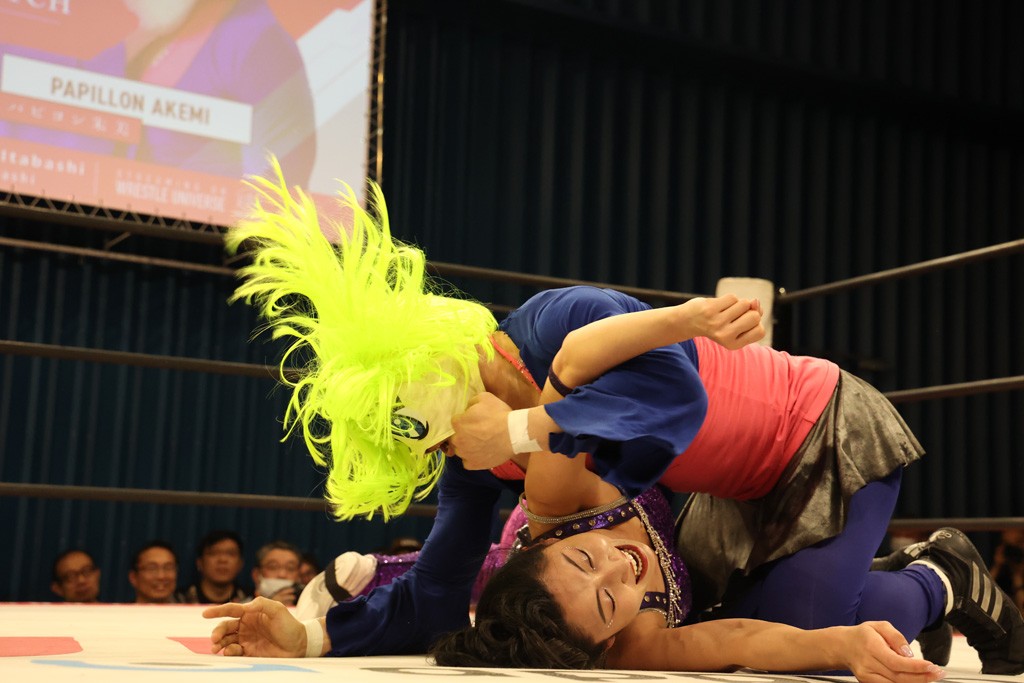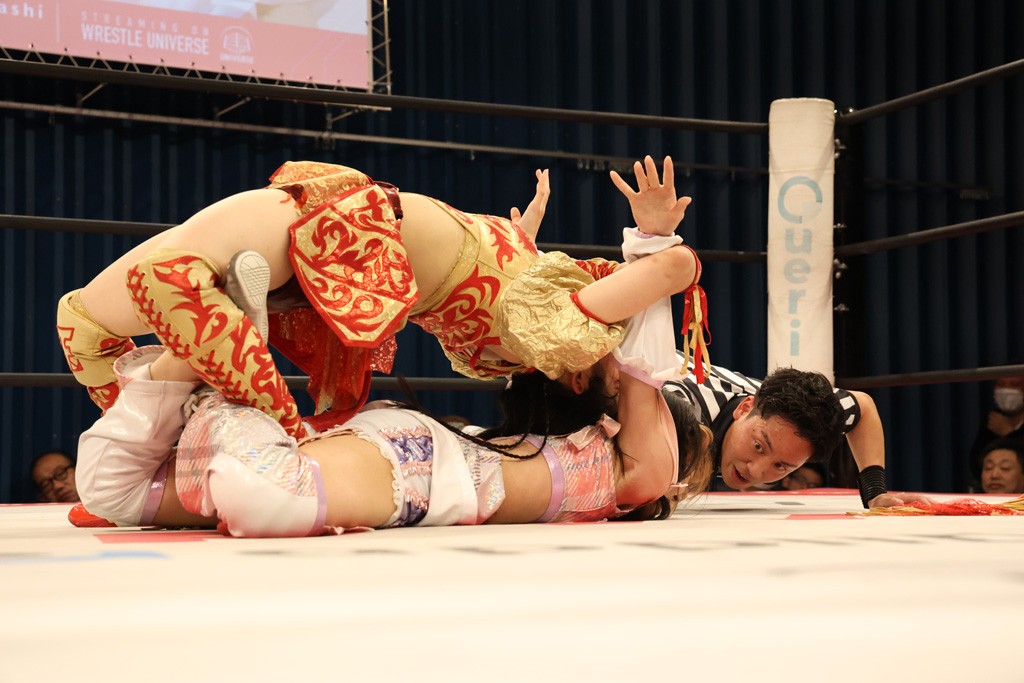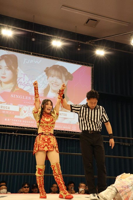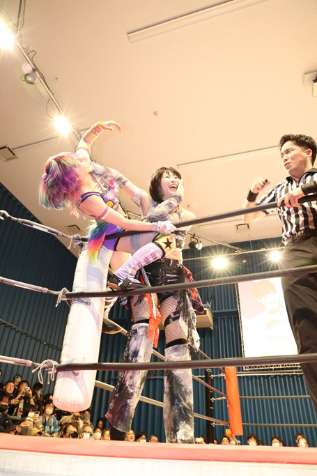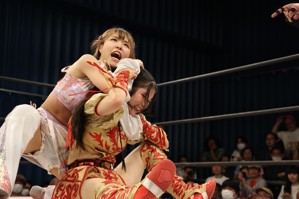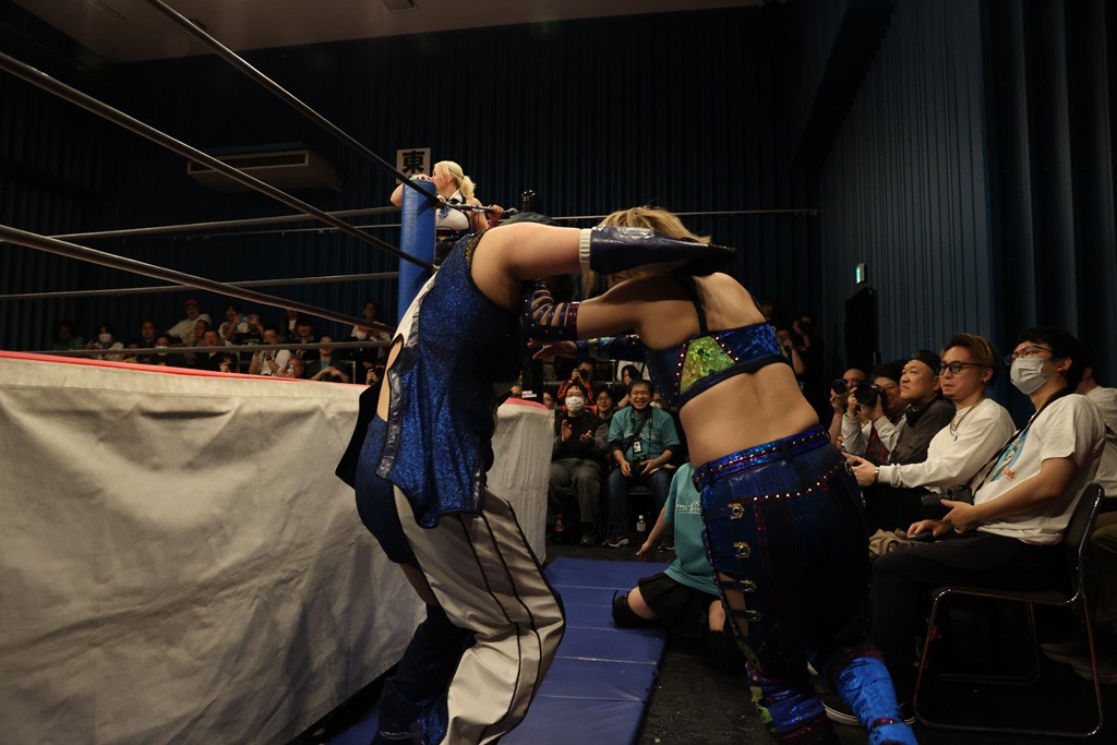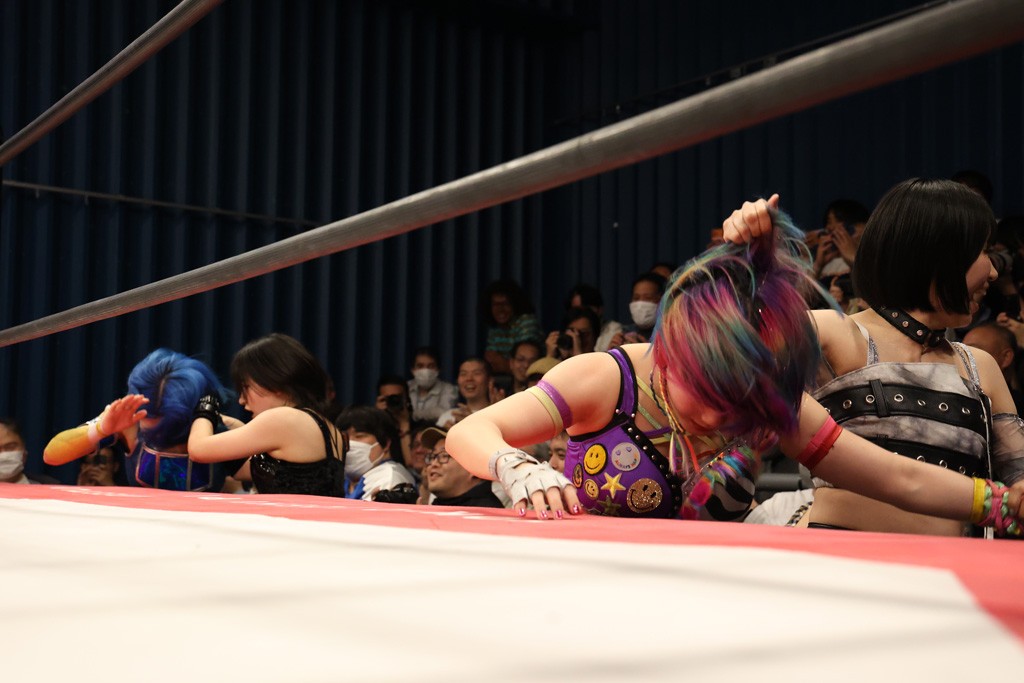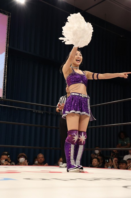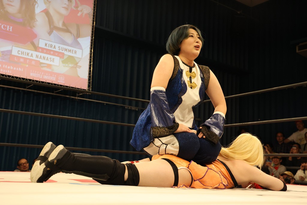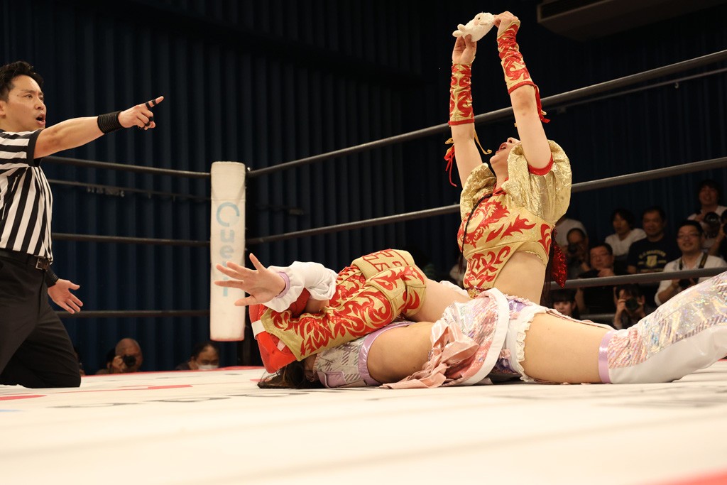 メイと小夏は昨年9月の大田区以来の対戦で初シングル。小夏の握手はメイが拒否して場内ブーイング。メイのダイヤル固めからのニコニコフォールに小夏もぶりっ子ポーズを見せるとメイは突き飛ばしエルボーの応酬。メイは小夏にアームツイストからフェースクラッシャー、さらに羽根折り固めを極めながら羊のぬいぐるみを奪って挑発。コーナーに羊をセットして小夏を投げんとするも小夏は叩きつけられることを拒否してエルボー連打。しかしメイはボディースラムを投げ返し、さらに羊を叩きつける。小夏は回転エビ固めからドロップキックで反撃。腕に噛みつくメイに小夏はドロップキックから串刺しドロップキック、ボディースラム、スリーパーと畳みかける。メイもサブミッションでやり返すが小夏がロープに足を伸ばす。ダイビング・フットスタンプは小夏が回避してオクラホマロール。カウント2で返されるとバンデーラから回転エビ固めもカウント2。こなつくらっしゅからひつじ座コメットを狙うが空を切るとメイがセカンドロープからの反転式フットスタンプ、そしてガトー・インビジブルでギブアップ勝ち。