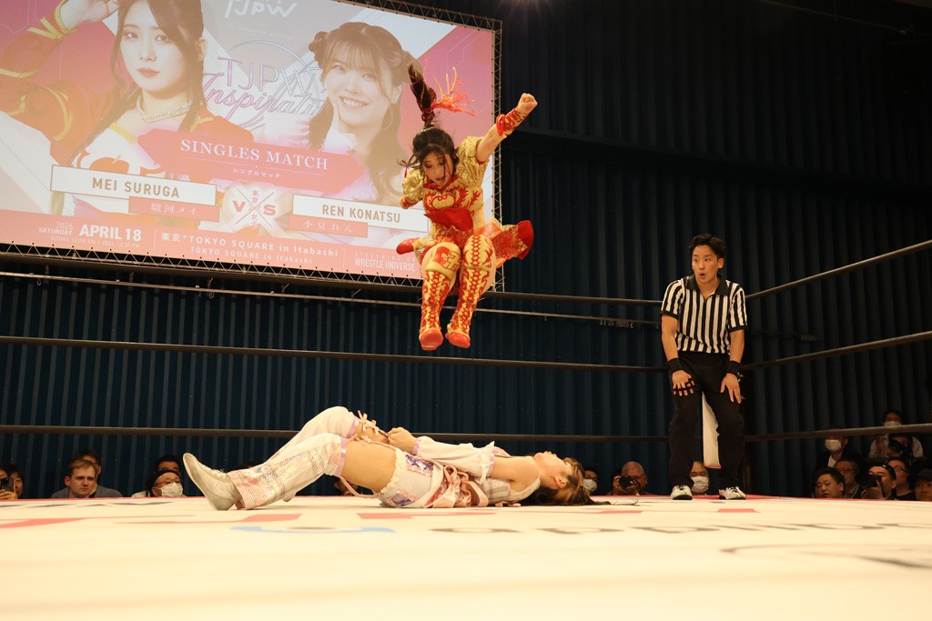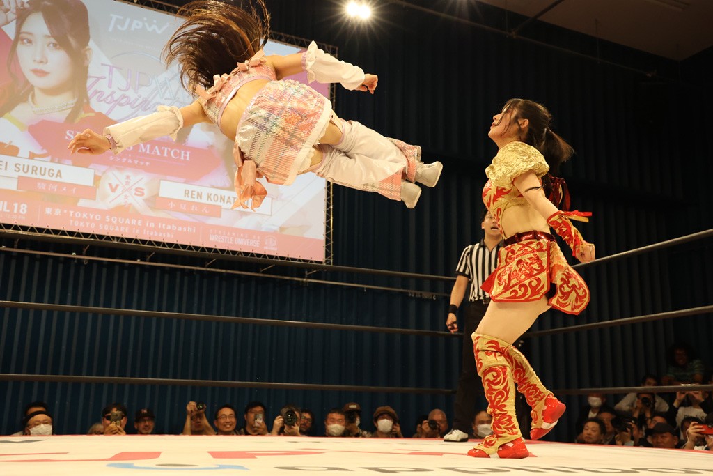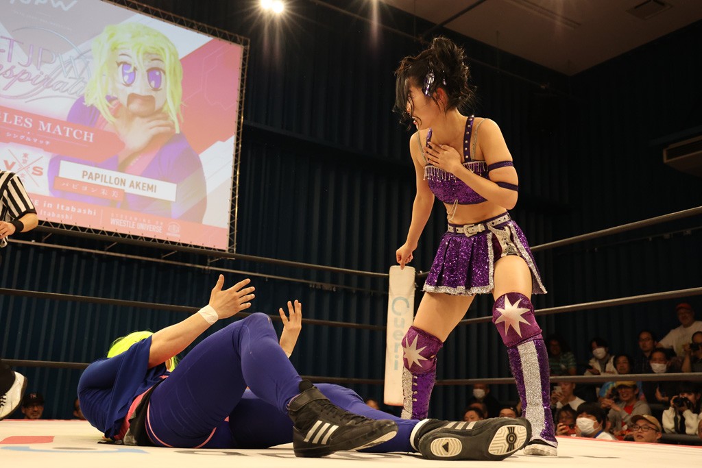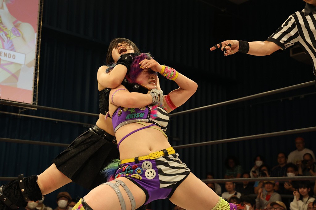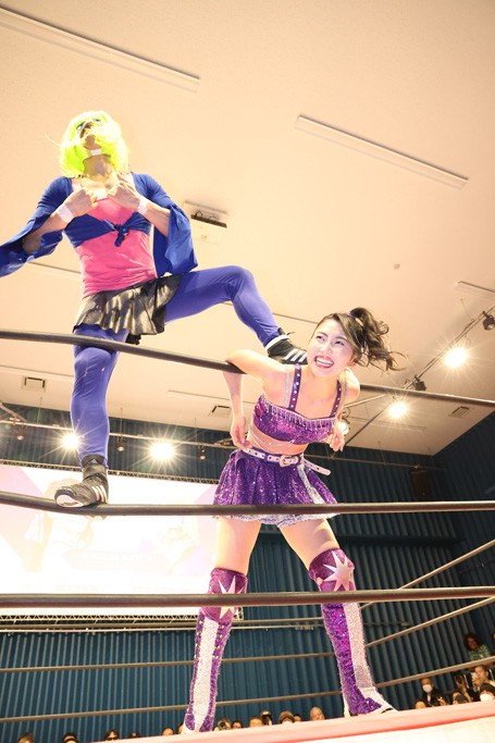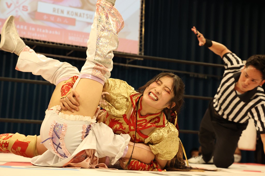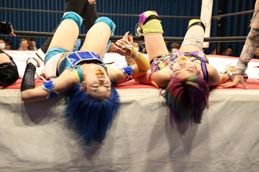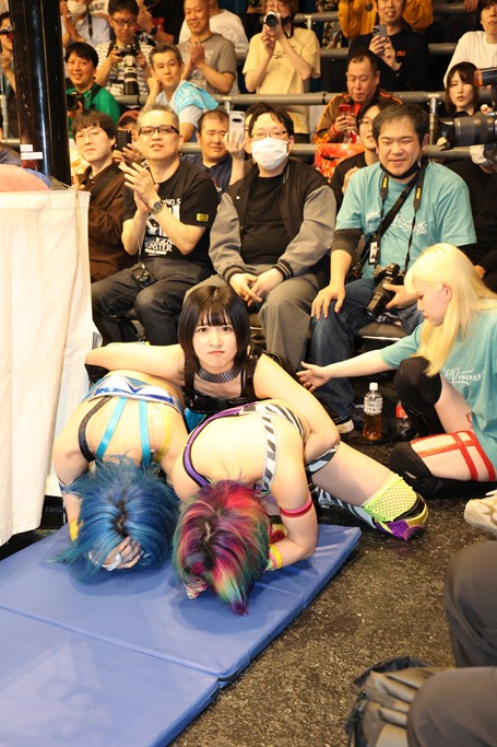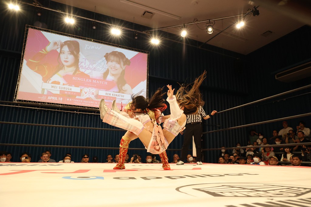 メイと小夏は昨年9月の大田区以来の対戦で初シングル。小夏の握手はメイが拒否して場内ブーイング。メイのダイヤル固めからのニコニコフォールに小夏もぶりっ子ポーズを見せるとメイは突き飛ばしエルボーの応酬。メイは小夏にアームツイストからフェースクラッシャー、さらに羽根折り固めを極めながら羊のぬいぐるみを奪って挑発。コーナーに羊をセットして小夏を投げんとするも小夏は叩きつけられることを拒否してエルボー連打。しかしメイはボディースラムを投げ返し、さらに羊を叩きつける。小夏は回転エビ固めからドロップキックで反撃。腕に噛みつくメイに小夏はドロップキックから串刺しドロップキック、ボディースラム、スリーパーと畳みかける。メイもサブミッションでやり返すが小夏がロープに足を伸ばす。ダイビング・フットスタンプは小夏が回避してオクラホマロール。カウント2で返されるとバンデーラから回転エビ固めもカウント2。こなつくらっしゅからひつじ座コメットを狙うが空を切るとメイがセカンドロープからの反転式フットスタンプ、そしてガトー・インビジブルでギブアップ勝ち。