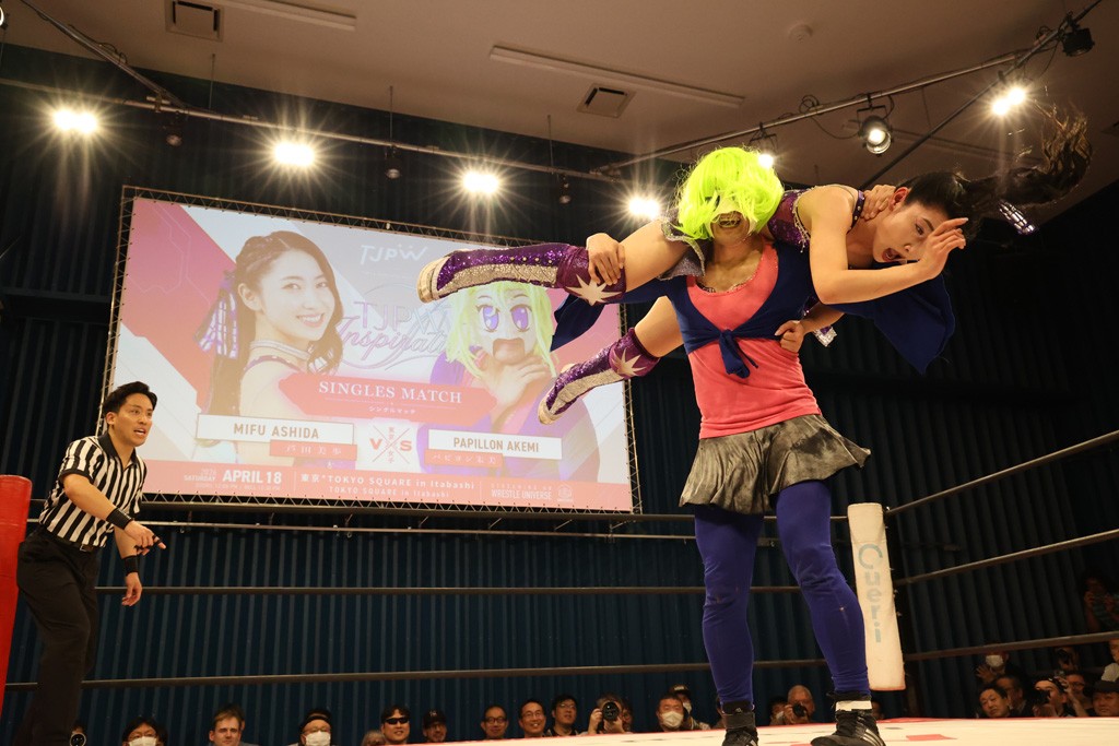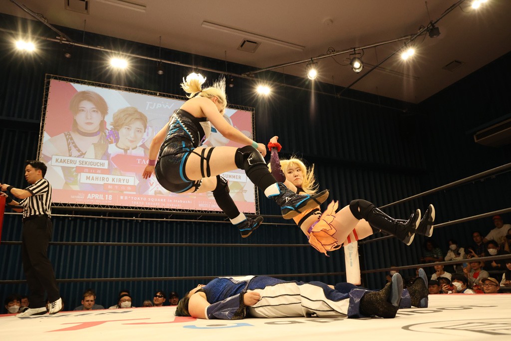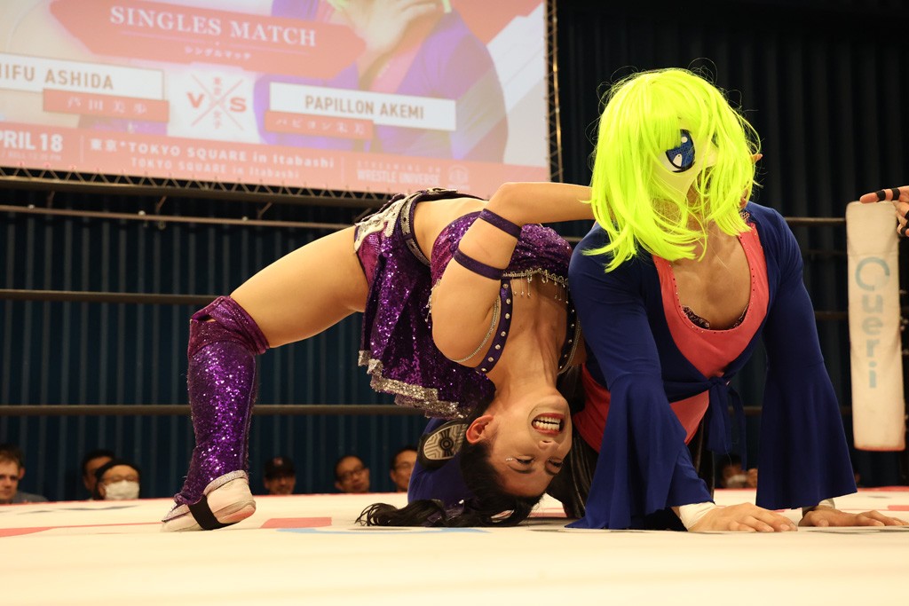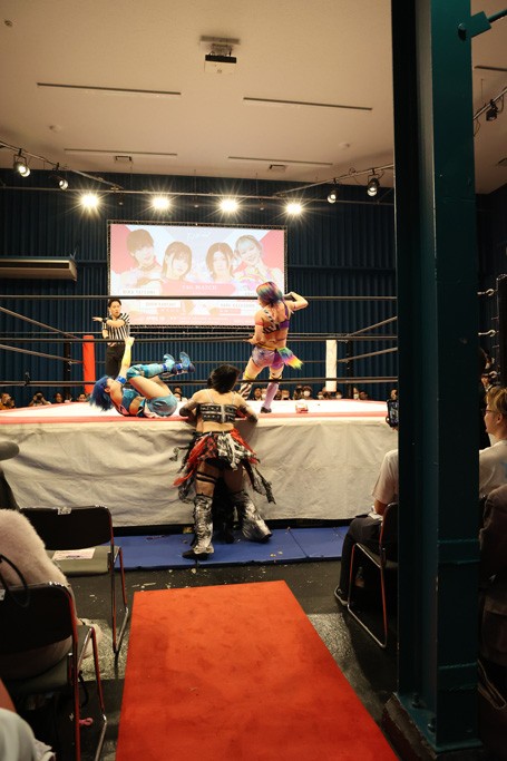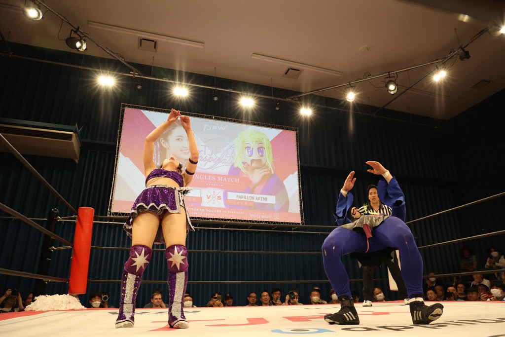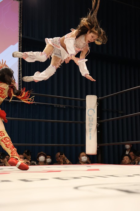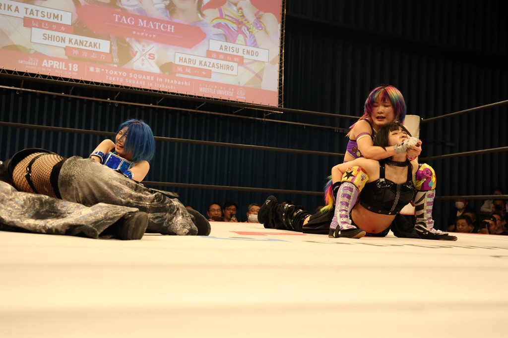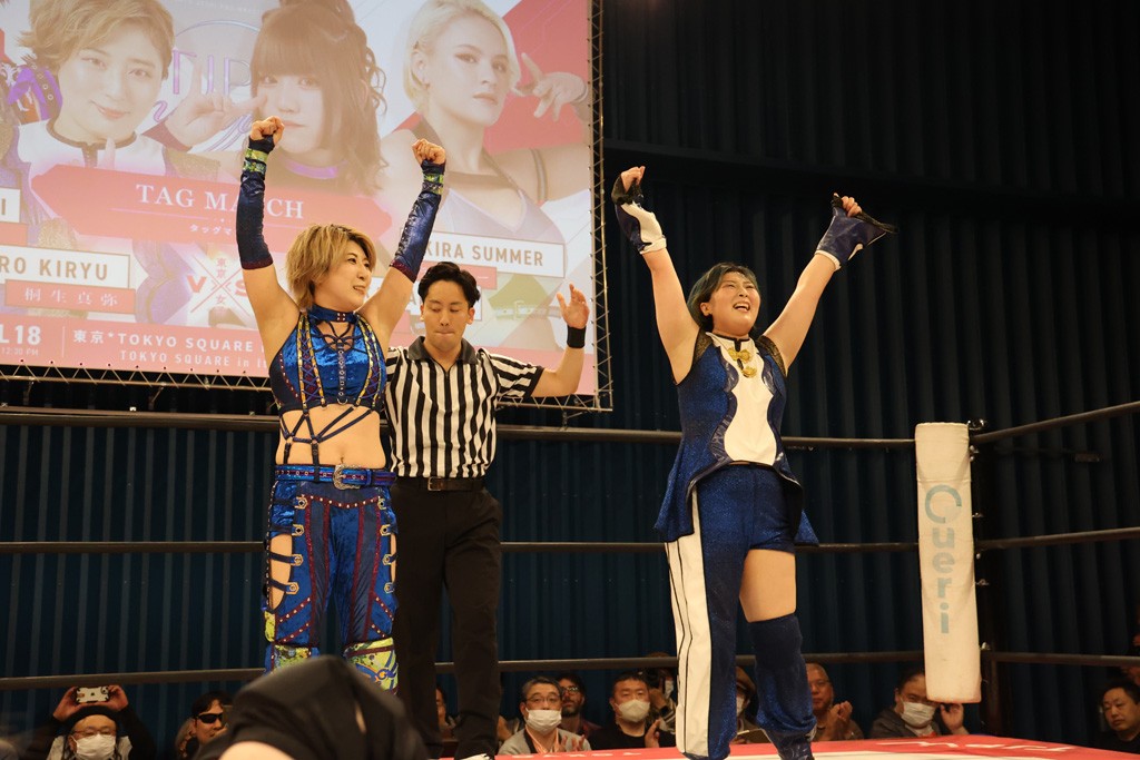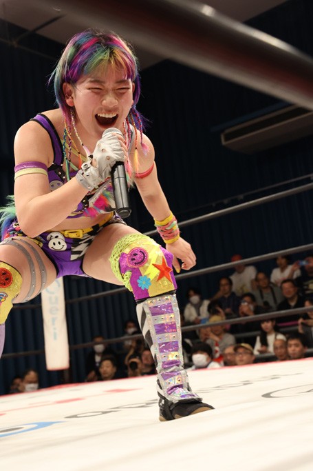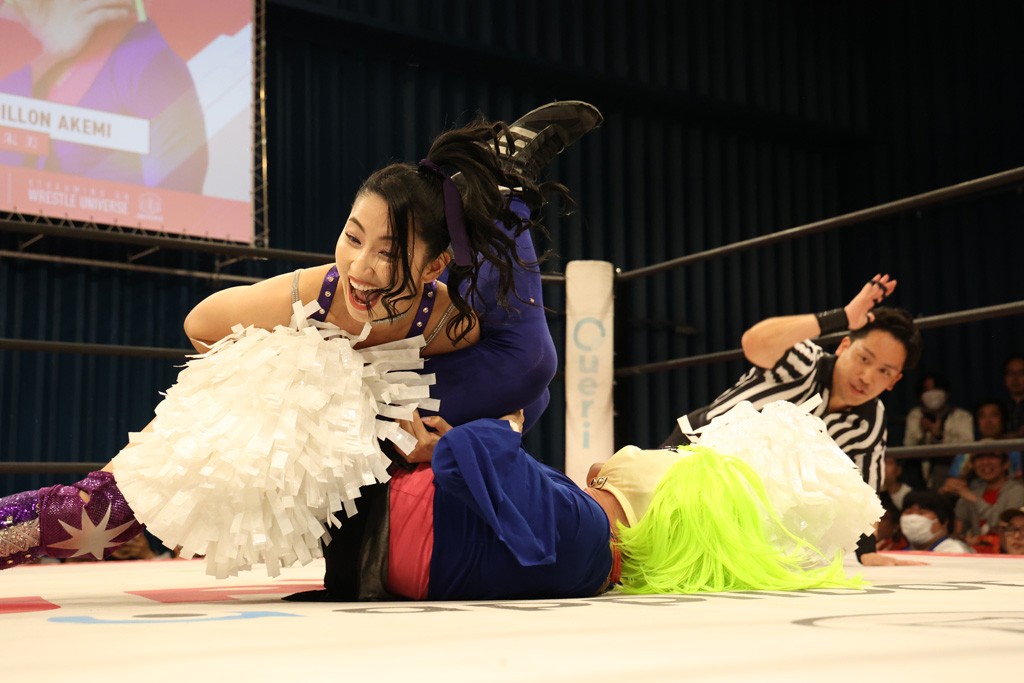 メイと小夏は昨年9月の大田区以来の対戦で初シングル。小夏の握手はメイが拒否して場内ブーイング。メイのダイヤル固めからのニコニコフォールに小夏もぶりっ子ポーズを見せるとメイは突き飛ばしエルボーの応酬。メイは小夏にアームツイストからフェースクラッシャー、さらに羽根折り固めを極めながら羊のぬいぐるみを奪って挑発。コーナーに羊をセットして小夏を投げんとするも小夏は叩きつけられることを拒否してエルボー連打。しかしメイはボディースラムを投げ返し、さらに羊を叩きつける。小夏は回転エビ固めからドロップキックで反撃。腕に噛みつくメイに小夏はドロップキックから串刺しドロップキック、ボディースラム、スリーパーと畳みかける。メイもサブミッションでやり返すが小夏がロープに足を伸ばす。ダイビング・フットスタンプは小夏が回避してオクラホマロール。カウント2で返されるとバンデーラから回転エビ固めもカウント2。こなつくらっしゅからひつじ座コメットを狙うが空を切るとメイがセカンドロープからの反転式フットスタンプ、そしてガトー・インビジブルでギブアップ勝ち。