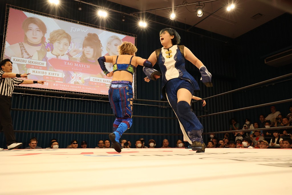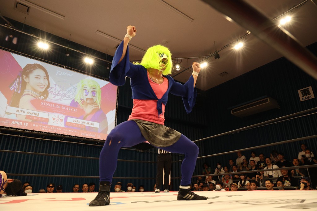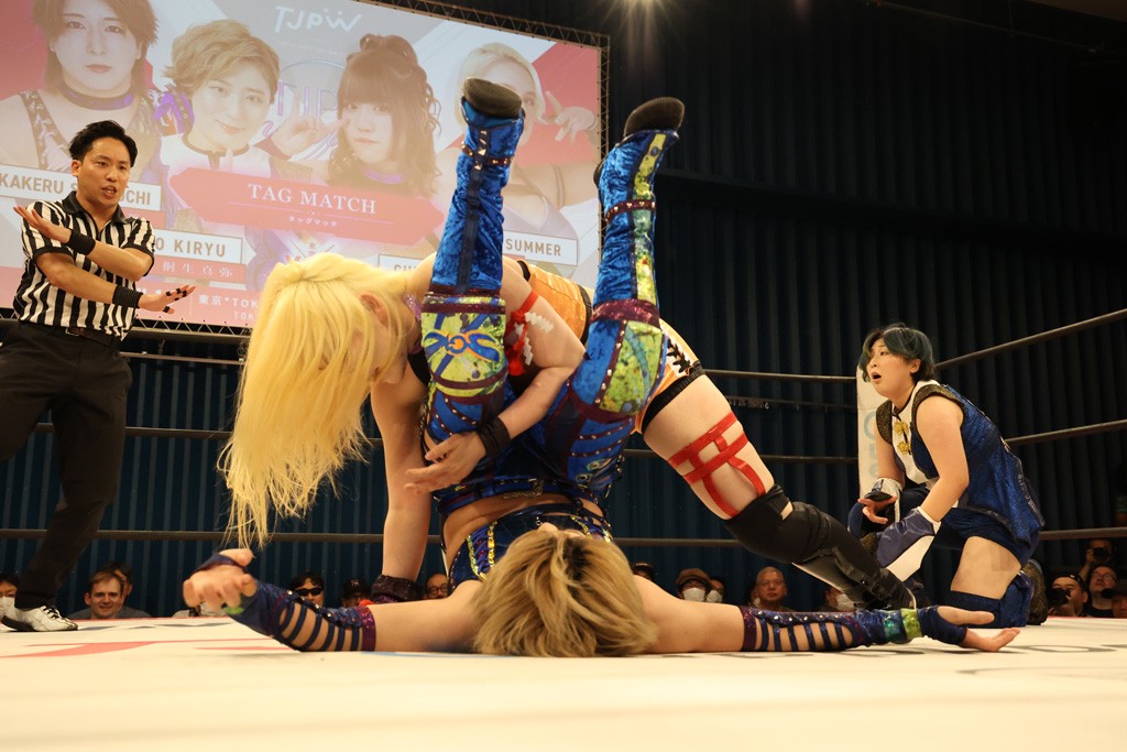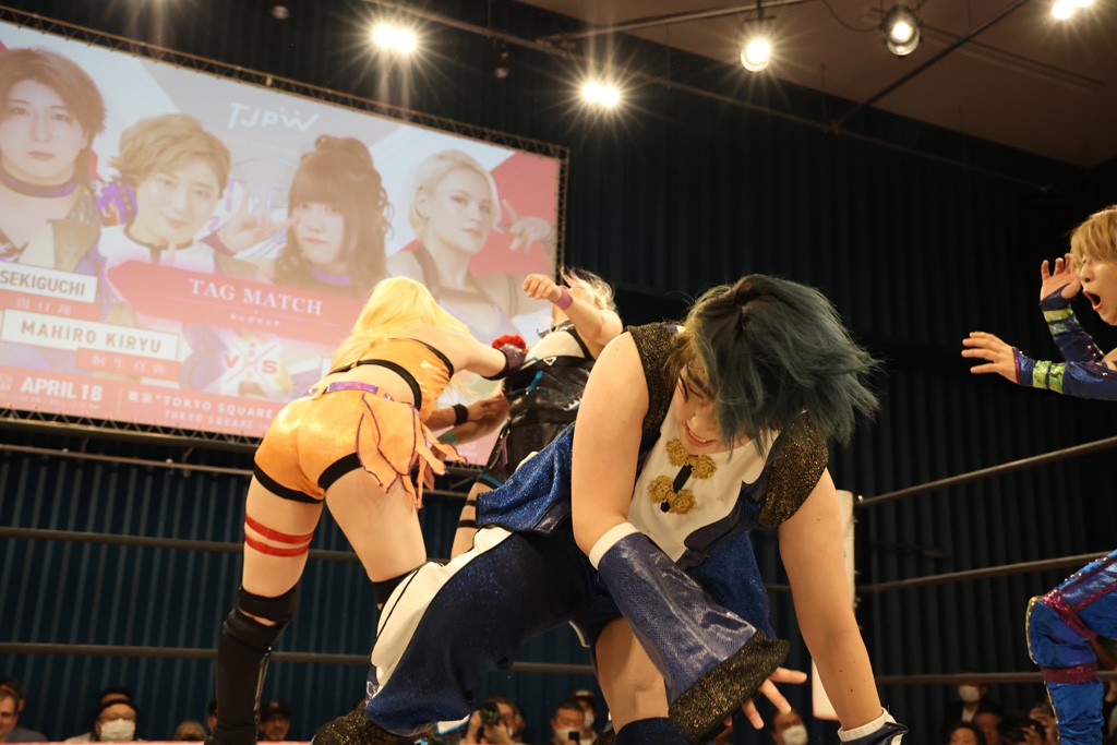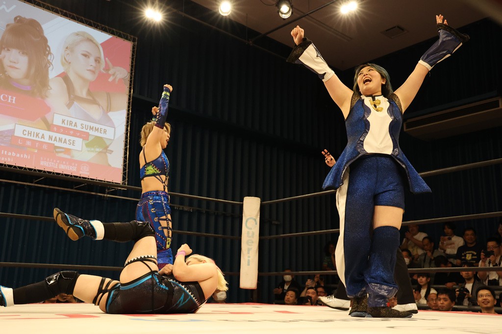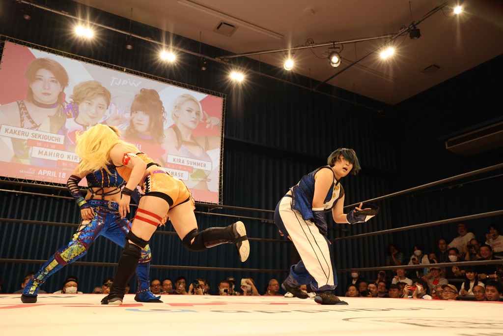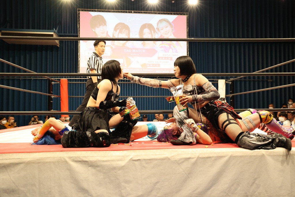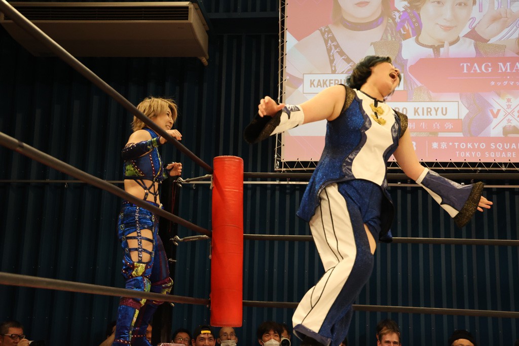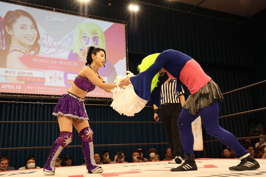 メイと小夏は昨年9月の大田区以来の対戦で初シングル。小夏の握手はメイが拒否して場内ブーイング。メイのダイヤル固めからのニコニコフォールに小夏もぶりっ子ポーズを見せるとメイは突き飛ばしエルボーの応酬。メイは小夏にアームツイストからフェースクラッシャー、さらに羽根折り固めを極めながら羊のぬいぐるみを奪って挑発。コーナーに羊をセットして小夏を投げんとするも小夏は叩きつけられることを拒否してエルボー連打。しかしメイはボディースラムを投げ返し、さらに羊を叩きつける。小夏は回転エビ固めからドロップキックで反撃。腕に噛みつくメイに小夏はドロップキックから串刺しドロップキック、ボディースラム、スリーパーと畳みかける。メイもサブミッションでやり返すが小夏がロープに足を伸ばす。ダイビング・フットスタンプは小夏が回避してオクラホマロール。カウント2で返されるとバンデーラから回転エビ固めもカウント2。こなつくらっしゅからひつじ座コメットを狙うが空を切るとメイがセカンドロープからの反転式フットスタンプ、そしてガトー・インビジブルでギブアップ勝ち。
