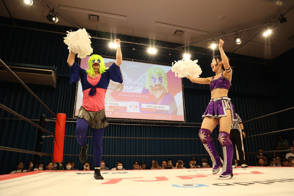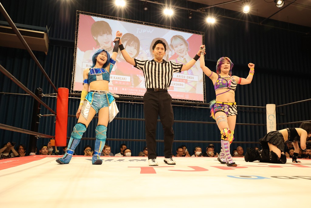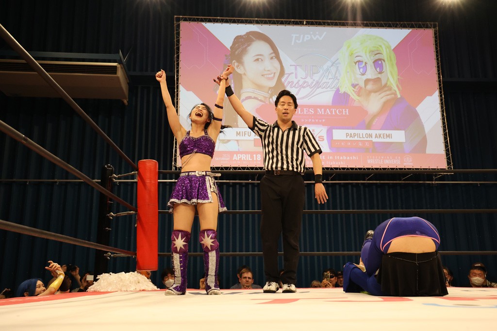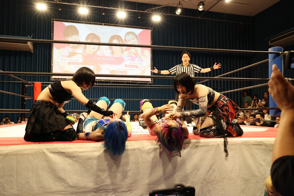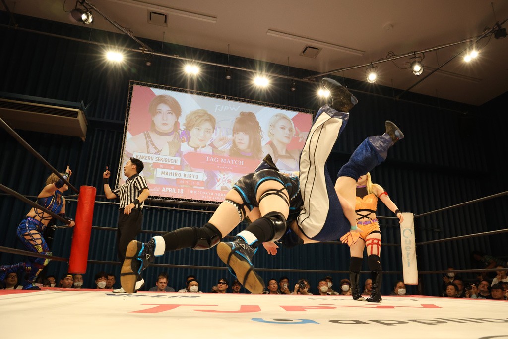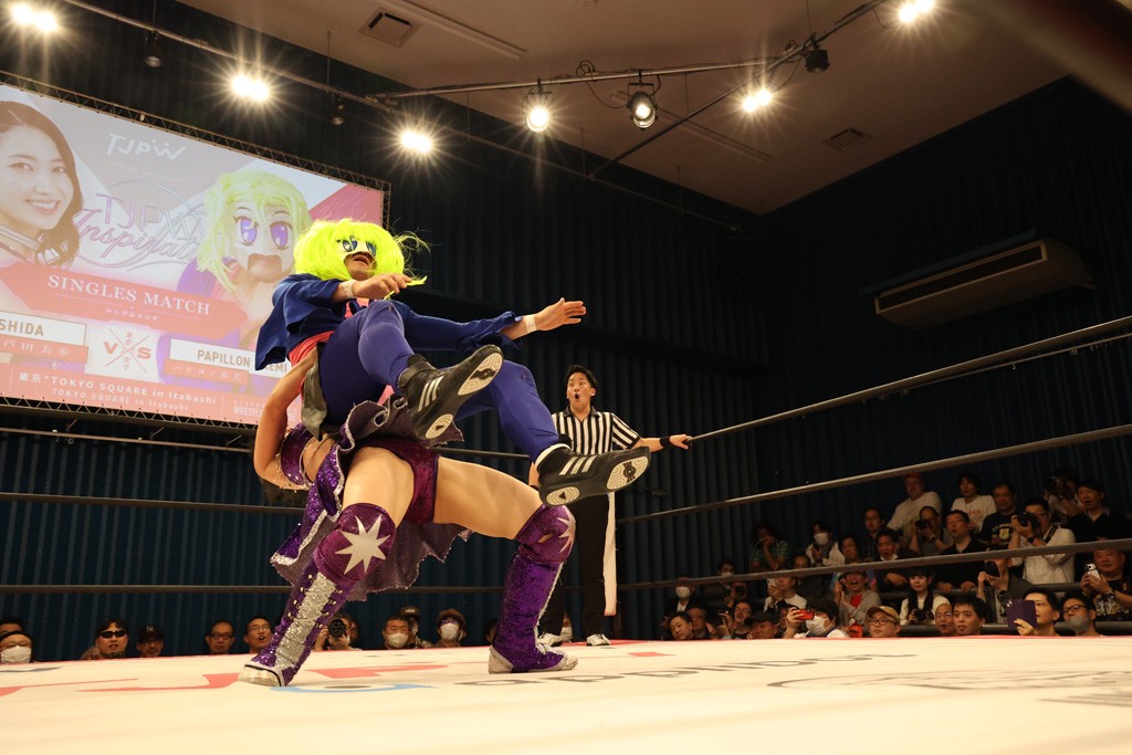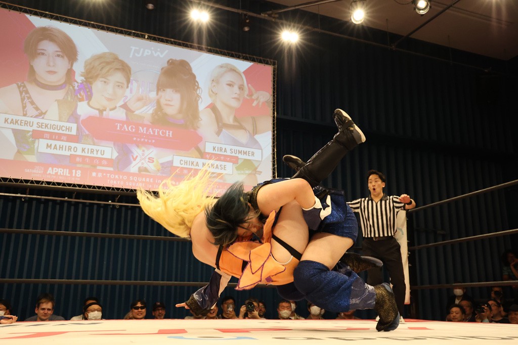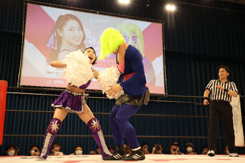 メイと小夏は昨年9月の大田区以来の対戦で初シングル。小夏の握手はメイが拒否して場内ブーイング。メイのダイヤル固めからのニコニコフォールに小夏もぶりっ子ポーズを見せるとメイは突き飛ばしエルボーの応酬。メイは小夏にアームツイストからフェースクラッシャー、さらに羽根折り固めを極めながら羊のぬいぐるみを奪って挑発。コーナーに羊をセットして小夏を投げんとするも小夏は叩きつけられることを拒否してエルボー連打。しかしメイはボディースラムを投げ返し、さらに羊を叩きつける。小夏は回転エビ固めからドロップキックで反撃。腕に噛みつくメイに小夏はドロップキックから串刺しドロップキック、ボディースラム、スリーパーと畳みかける。メイもサブミッションでやり返すが小夏がロープに足を伸ばす。ダイビング・フットスタンプは小夏が回避してオクラホマロール。カウント2で返されるとバンデーラから回転エビ固めもカウント2。こなつくらっしゅからひつじ座コメットを狙うが空を切るとメイがセカンドロープからの反転式フットスタンプ、そしてガトー・インビジブルでギブアップ勝ち。