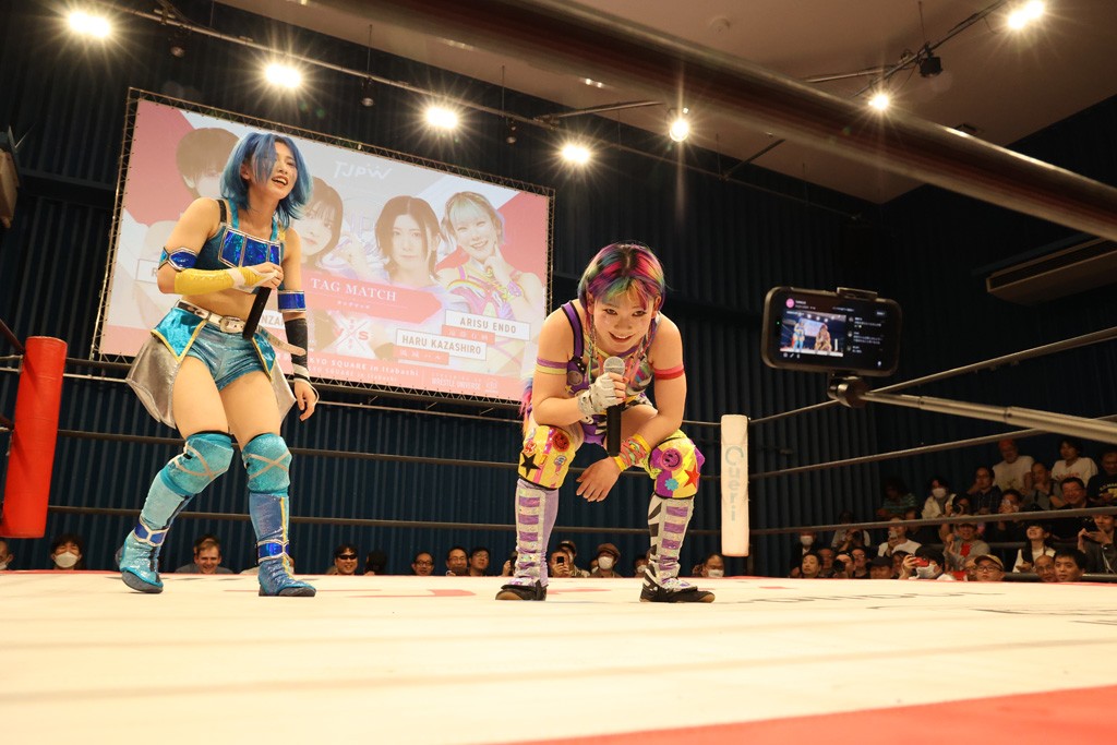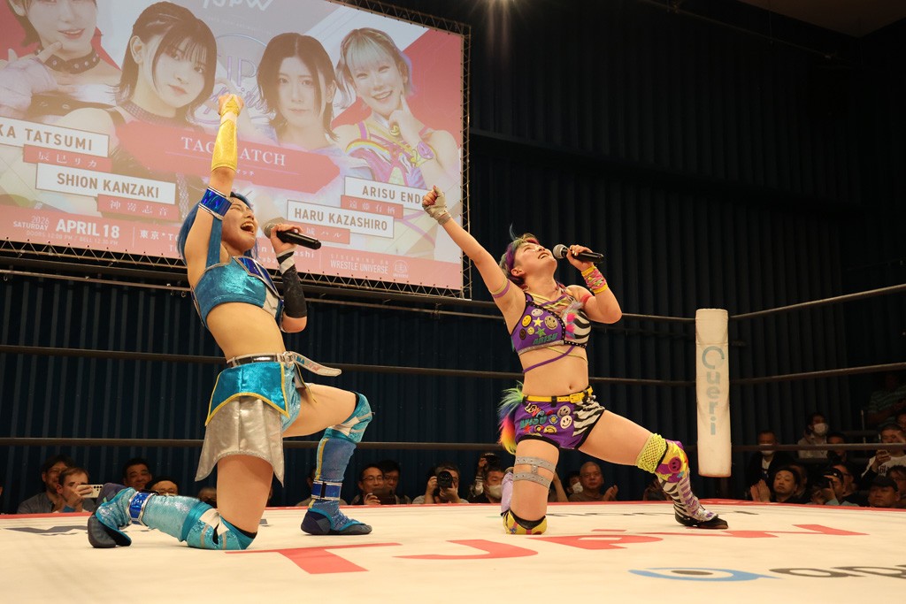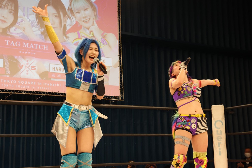メイ 小夏ちゃーん、久しぶりんごー! 今日もめちゃくちゃめちゃくちゃ楽しかったです! 東女の大方の皆様はアメリカに行って、むしろ日本を任されたということで、チョーやる気いっぱいでした。なんか小夏ちゃん、めちゃくちゃチョー今頑張ってると思うんだけど、メイから見たら小夏ちゃんの頑張り、こんぐらい(人差し指と親指でつまむ感じ)で、あと小夏ちゃんの残りの余白、こーんぐらい(かなり腕を高く伸ばして)にメイには見えました。だからこれからももっといっぱい闘いたいなと思います! そしてメイは5月4日の後楽園ホール大会に出場が決定しました! なんと駿河メイ、あと汐珠ちゃん、そして瑞希さん! もうこれは最強姉妹! なので皆さんぜひ見に来てください!
